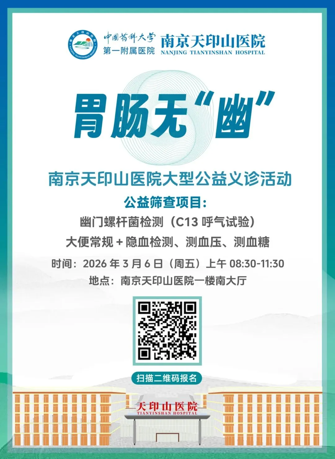 胃肠健康是身体健康的 “晴雨表”,早筛查、早干预才能早安心!2026年3月6 日上午,南京天印山医院门诊一楼南大厅,多学科专家已就位,多重健康福利已备好。无论你有胃肠不适、想做健康筛查,还是想了解慢性病与胃肠功能的关联,都欢迎前来参与,让我们一起守护胃肠健康,开启无 “幽” 无虑的生活!