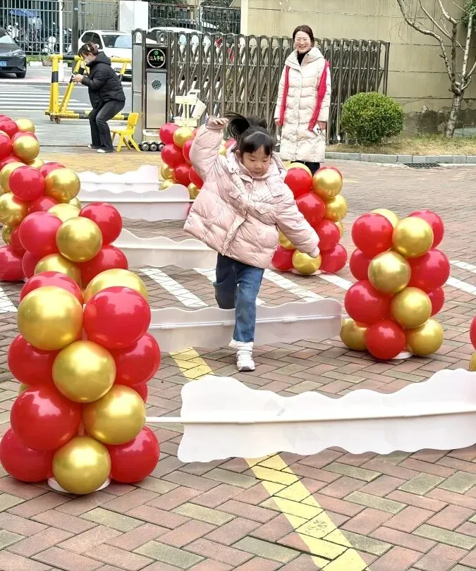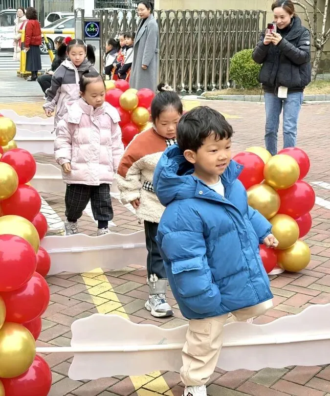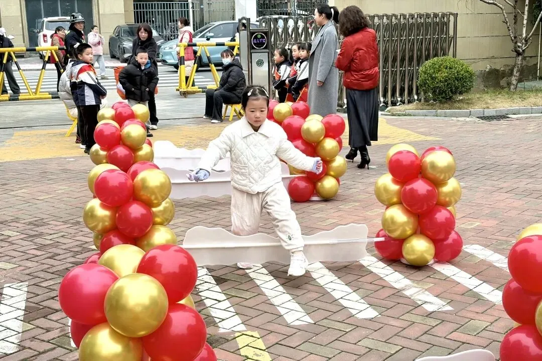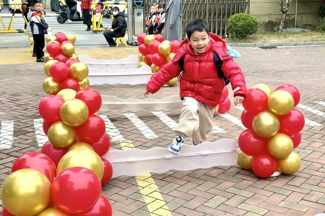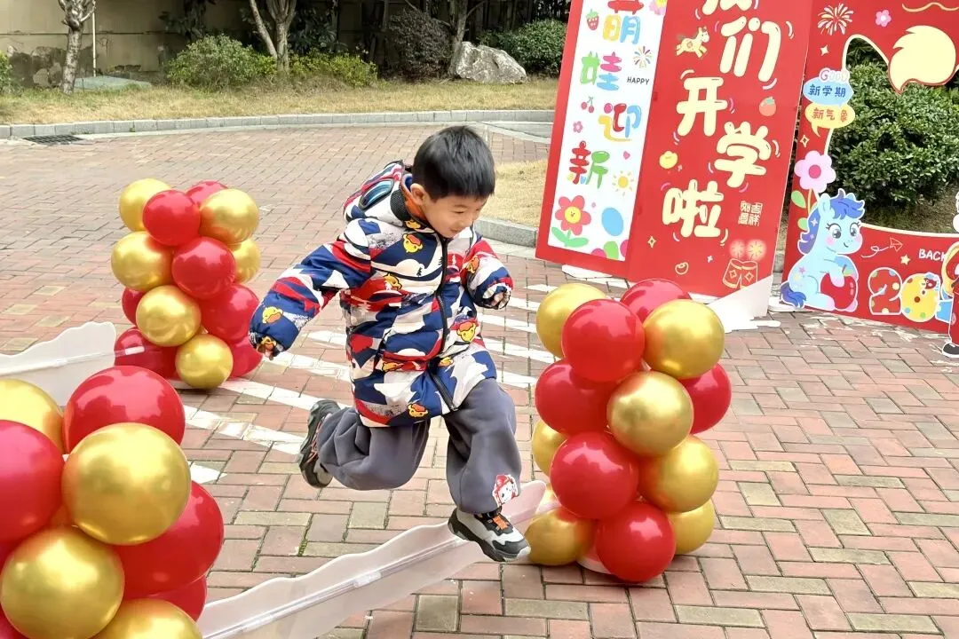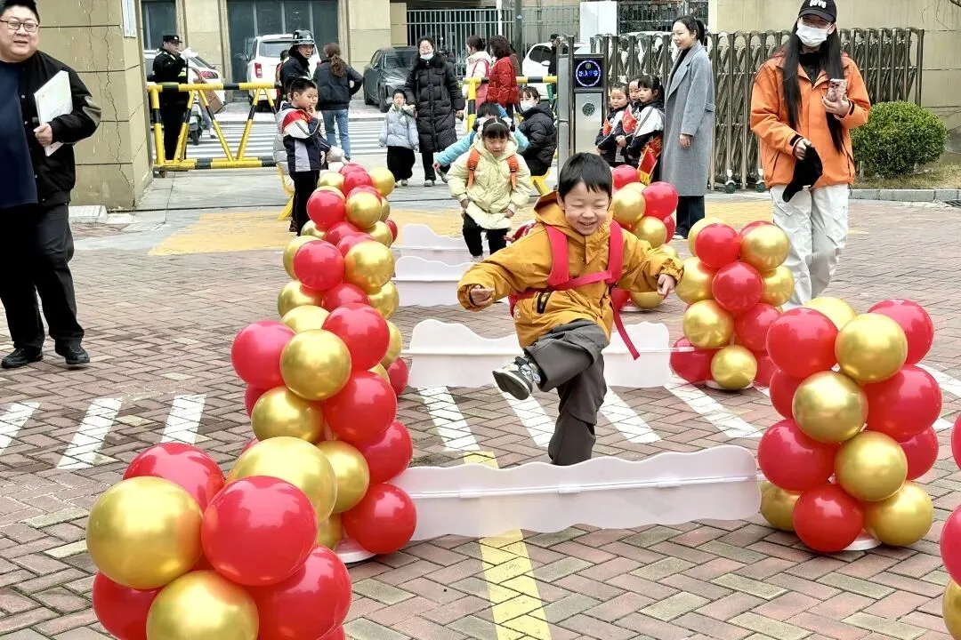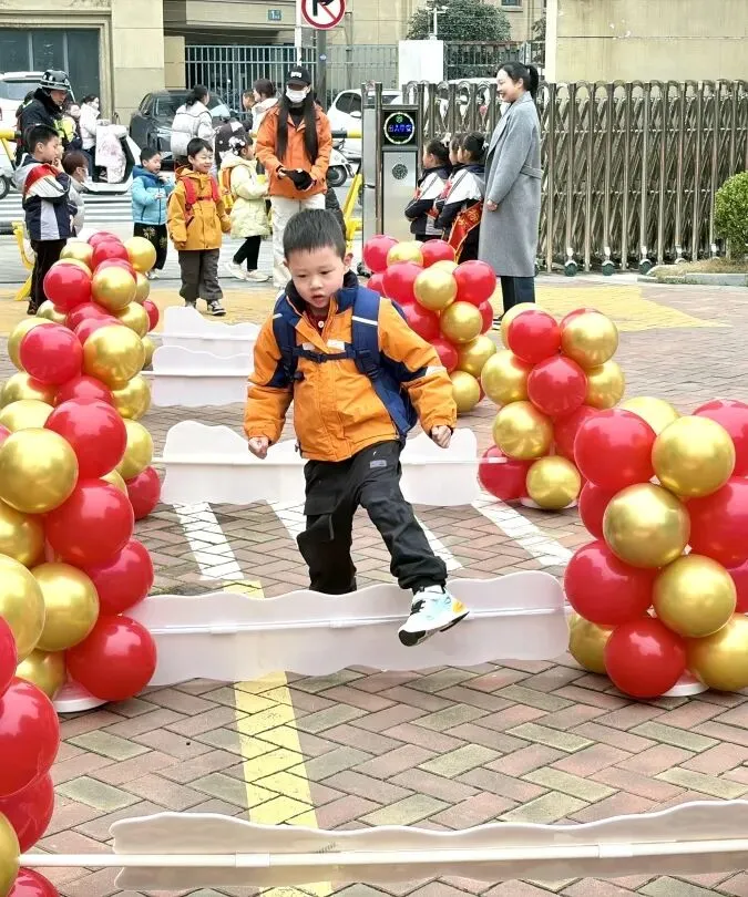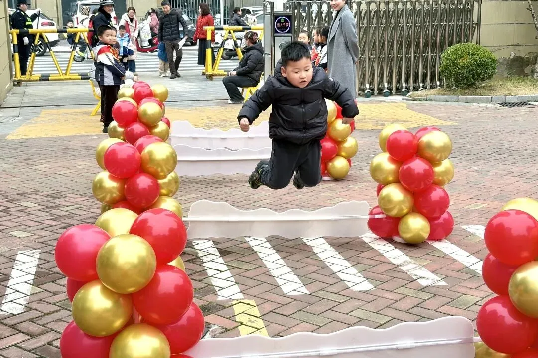 清晨,幼儿园内新春主题展板醒目亮眼,红色元素与童趣设计相映成趣,定格下新学期的美好开篇。老师们精心布置了寓意满满的开学跨栏,孩子们依次跨过“梦想启航”“茁壮成长”“聪明伶俐”“未来可期”“平安喜乐”的祝福栏,每一步都承载着成长的期许,稚嫩的脚步坚定又欢快。