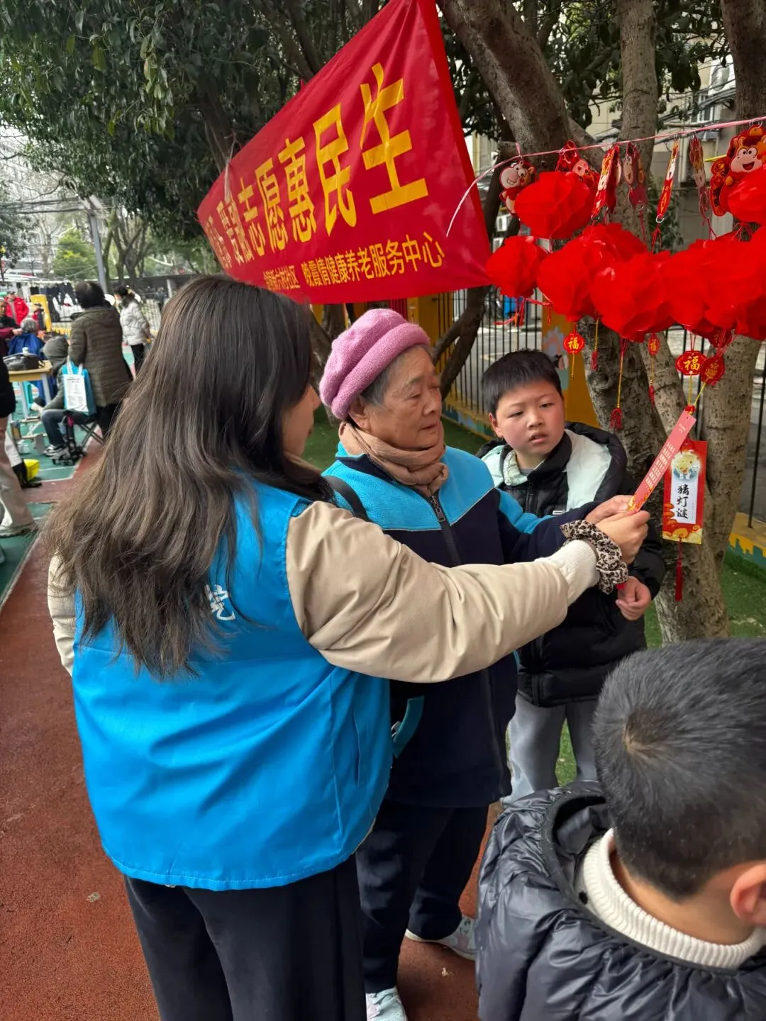 猜灯谜闹元宵,学雷锋暖民心。实践团精心打造的民俗灯谜区,五彩谜面迎风摇曳,涵盖民俗知识、趣味字谜、红色典故等丰富内容,成为社区里的欢乐打卡地。学子们以志愿者的身份,全程陪伴社区老少参与,牵着孩童逐字讲解谜面、引导思路,用耐心守护童趣;围着银发老人轻声念题、细细分析,用贴心助力圆梦,手把手帮老人摘下心仪灯谜、兑换礼品。老少同猜、志愿相伴,欢声笑语满溢现场,学雷锋的青春身影,让这场元宵民俗活动更具温度,也让雷锋精神在互动中悄然传递。