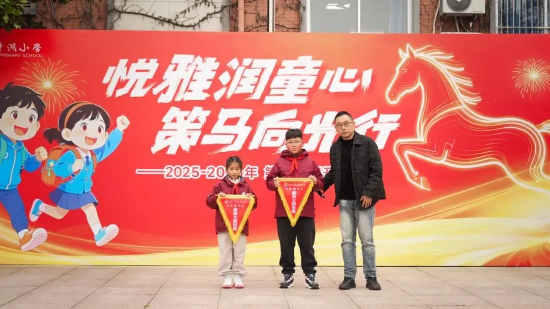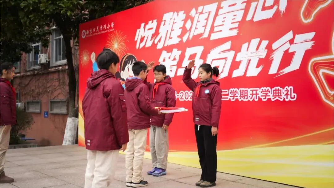 典礼尾声,王校长为上学期文明班级评比中表现突出的二(1)班和六(1)班,颁发“超级文明班级”锦旗。这两面锦旗将在本学期一直悬挂于获奖班级,既是对两个班级全体师生努力的表彰与肯定,更是对全校班级的激励与号召,引导全体学子共同践行文明规范、争做悦雅少年。