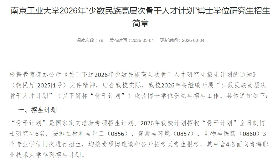“骨干计划”是国家定向培养专项招生计划。2026年我校计划招收“骨干计划”全日制博士研究生6名,安排在材料与化工(0856)、资源与环境(0857)、生物与医药(0860)3个专业学位门类进行招生,均接受硕博连读和公开招考类考生报考,其中含4名面向青海职业技术大学单列招生计划。