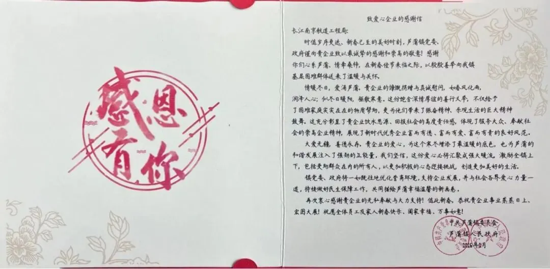 感谢信指出,我局的慷既捐赠与真诚慰问,如春风化雨,润泽人心;似冬日暖阳,驱散寒意。这份饱含深情厚谊的善行义举,不仅给予了困难家庭实实在在的物质帮助,更为他们带来了振奋精神、乐观生活的巨大精神鼓舞。充分彰显了我局饮水思源、回报社会的高度责任感,体现了服务大众、奉献社会的崇高企业精神,展现了新时代优秀企业富而有德、富而有爱、富而有责的良好风范。下一步,长江南京航道工程局将继续常态化开展爱心公益行动,持续关注地方民生发展,以点滴爱心汇聚温暖力量,与社会各界携手同行,让温暖常在、让爱心延续。