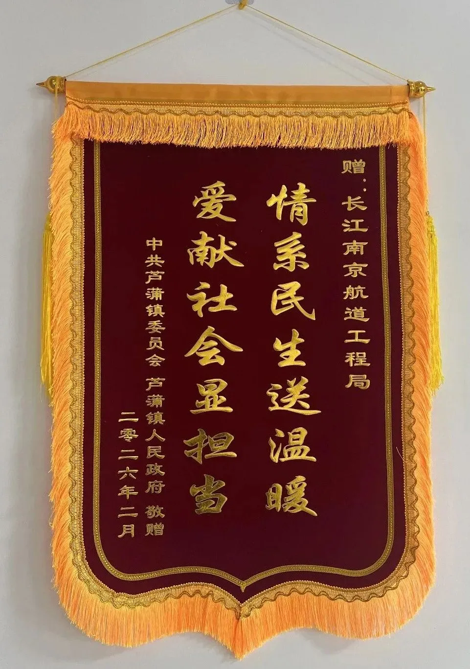 近日,南京工程局淮河入海水道项目部收到盐城市阜宁县芦蒲镇党委、政府感谢信与锦旗,对该项目部在“情系芦蒲·暖冬同行”公益帮扶活动中,为困难家庭、孤寡老人、留守儿童等群体送去温暖与关怀表示衷心的感谢。