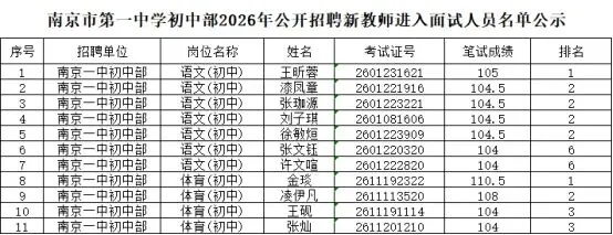 根据《南京市秦淮区教育局所属学校2026年1月公开招聘教师公告》(秦事招公告[2026]1号),在南京市秦淮区教育局监督指导下,我校资格复审工作已经结束,王昕蓉等11人通过资格复审,具备面试资格,具体人员名单及排名附后。
