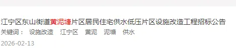 值得一提的是,《江宁区东山街道黄泥塘片区居民住宅供水低压片区设施改造工程的招标计划》已经发布,预计本月就正式启动。