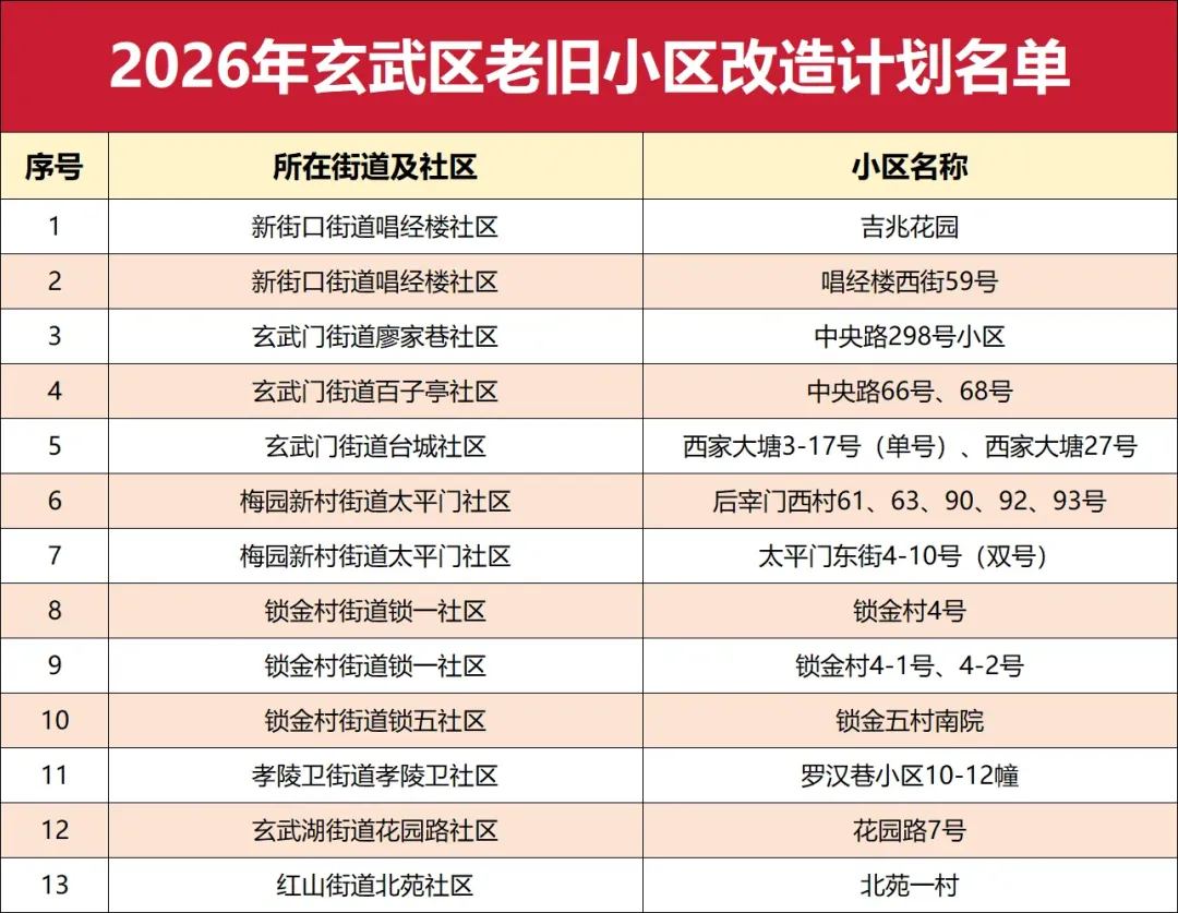 就在刚刚,玄武区率先公布2026年老旧小区改造名单,一共13个小区!覆盖新街口、玄武门、梅园新村、锁金村、孝陵卫、玄武湖、红山7个街道。改造内容涵盖公共部位整治、设施更新、环境提升三大板块。