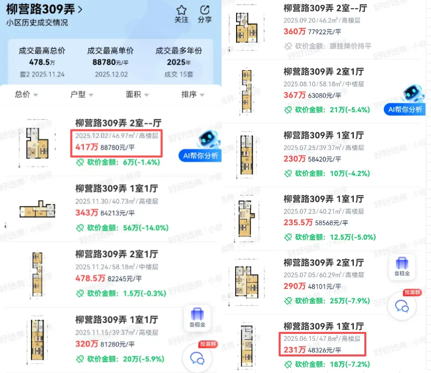 根据二手房平台展示的数据,柳营路309弄最新房源成交单价已经达到了88780元/㎡,直接刷新了该小区最高纪录。