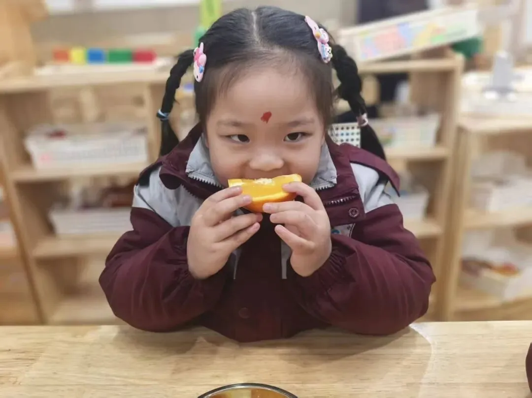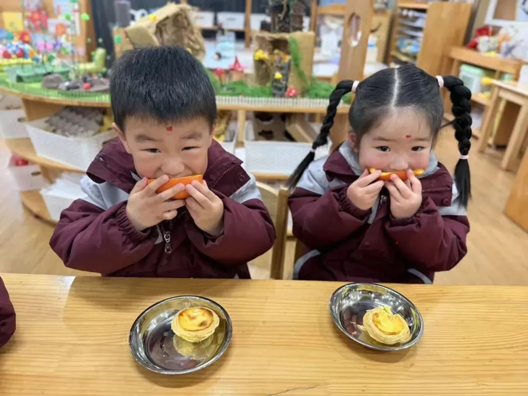 春日滋味,舌尖绽放。软糯的青团、清甜的火龙果,酸甜的橙子是幼儿园为孩子们准备的 “咬春” 美食。孩子们大快朵颐,食欲大开,在品尝春日美味的同时,感受传统习俗的乐趣,愿宝贝们吃得香、长得棒,健康快乐每一天。