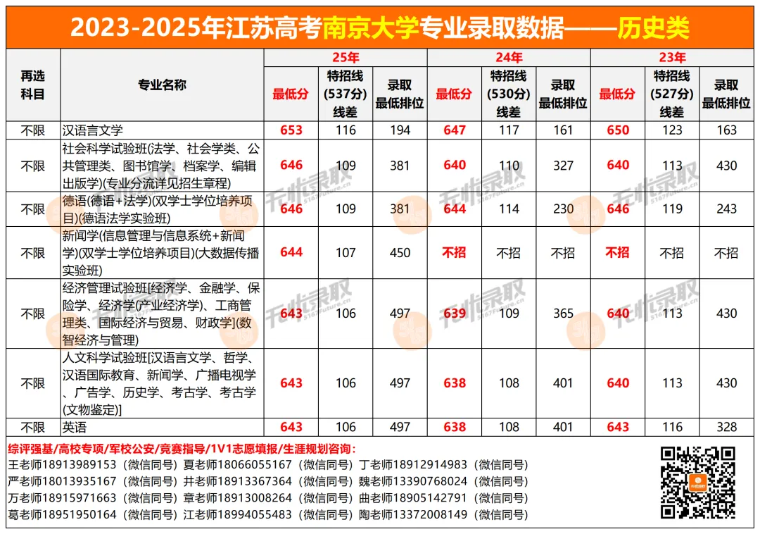 2025年南京大学历史类最高653分(汉语言文学),最低643分(经济管理试验班、人文科学试验班、英语)。