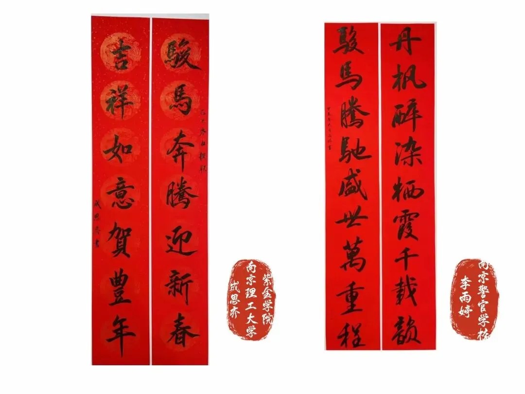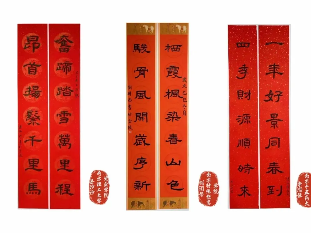 栖霞钟灵毓秀,文韵绵长;仙林学府云集,英才荟萃。参展诸作,出自区内高校青年学子之手,或楷法端严、或行笔流畅、或隶意朴茂、或篆韵古雅,联语既承祈福纳祥之传统,亦含修身报国之情怀,更见扎根栖霞、书写时代之新意。一纸春联,写尽新春意;数行笔墨,承载少年心。