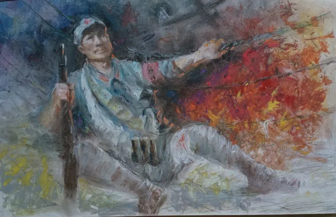 陆有根《负伤红军战士勇渡绳索桥》38x58cm