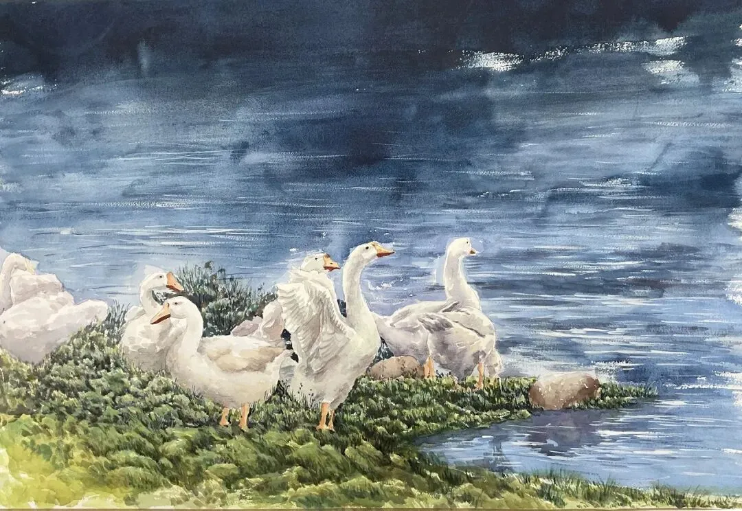 张勤孟《绿岸白鹅闲》56x76cm