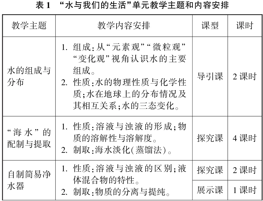 从学生学习角度出发,水作为生活中最常见的物质以及液体的典型代表,以水为载体进行项目式学习符合学生的认知基础,但学生认知的科学性、统整性与系统性仍有待内化与提升。基于以上分析,确立本案例教学主题和内容安排(见表1)。