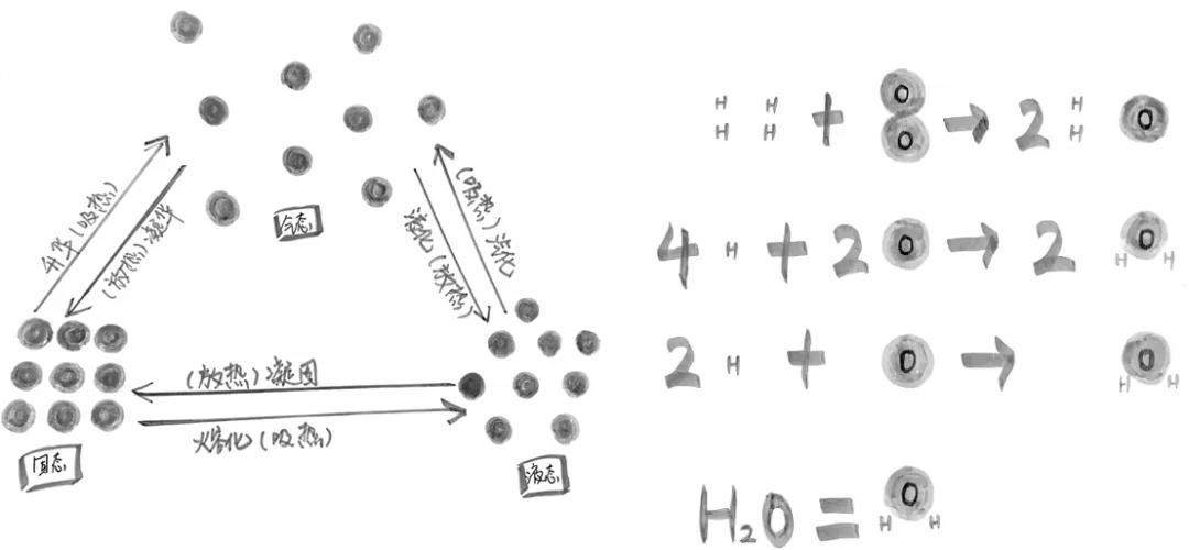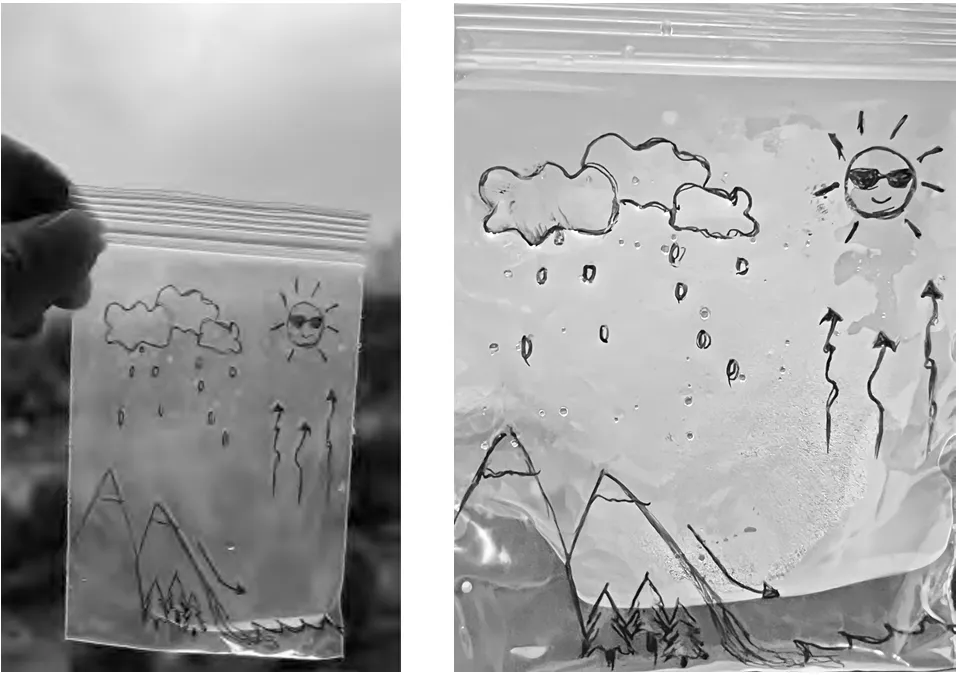 [导引课]在导引课“识水”任务中,学生结合课前“自制水循环感官袋”(见图4),进行水的观察与认识,以图文的形式描述自然界中水的三态变化,在宏观上形成水的感性认识。之后,学生通过Flash动画“水的三态变化”从微观层面探寻其本质,并通过电解水实验及其生成物检验进一步探索水的结构。学生通过“水的三态变化”与“电解水”微观示意图的前后比较(见图5),感受物理变化与化学变化的区别,将多个“点”化为一个“面”,形成“物质的结构决定性质”的观念,实现宏观思维向微观思维方式的转变......