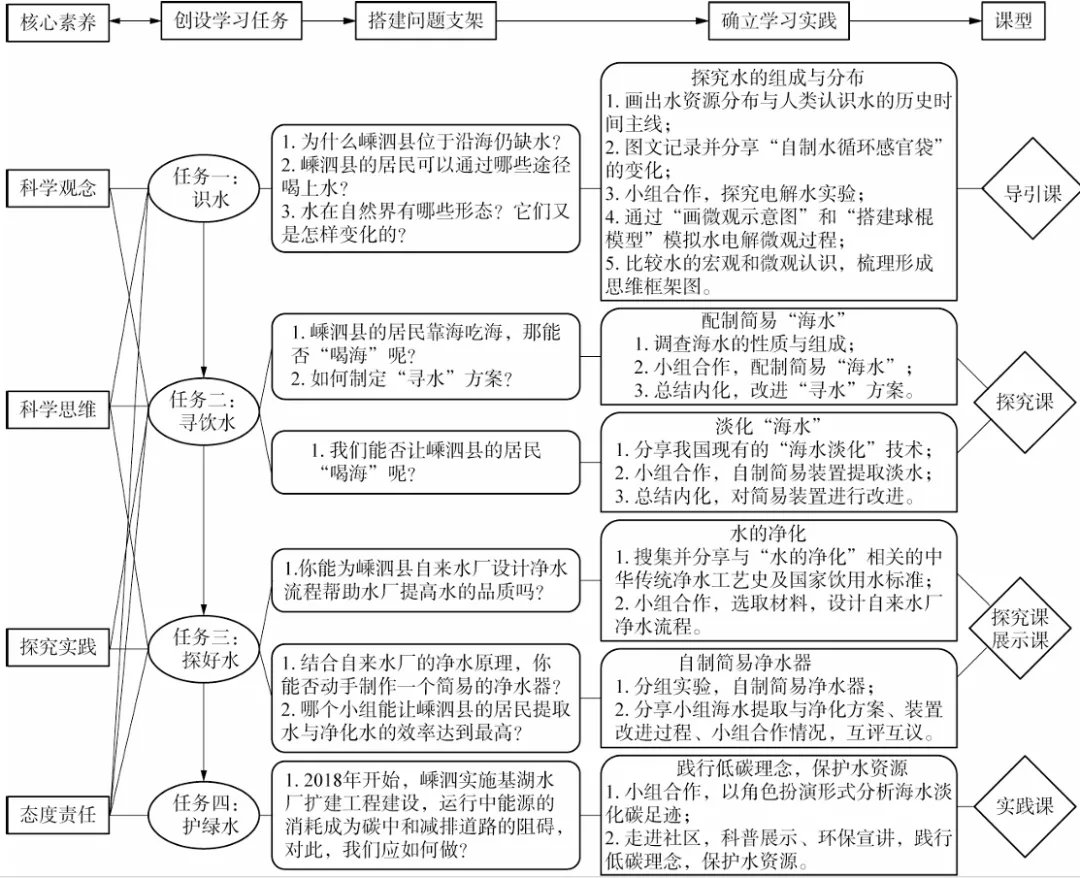 通过“海水淡化”“自制简易净水器”项目式活动,从生产实际出发寻找淡水并设计净水路线,在材料选择、方案设计、产品制作和检验分析的过程中提升技术与工程实践能力,并在解决海水淡化与净化的实际问题中提出自我创见,发展探究实践核心素养。