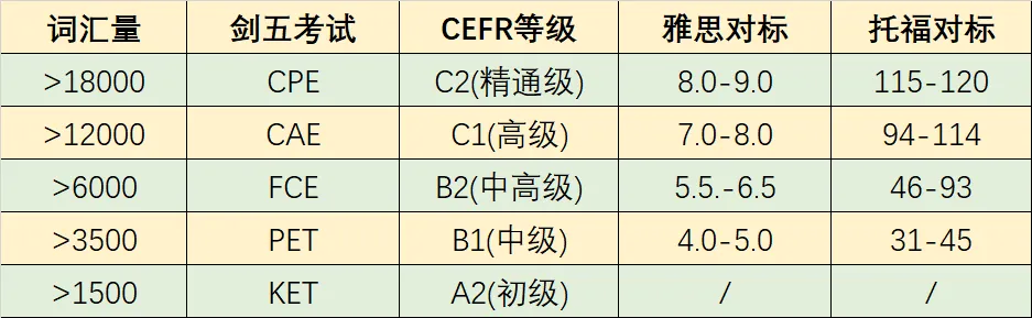 剑桥五级考试可以无缝衔接雅思、托福等出国标化考试,KET相当于雅思4分以下,PET相当于4-5分,FCE相当于雅思5.5-6.5分,学习KET、PET、FCE,可以帮助学生为雅思、托福考试做好预备和基础铺垫。