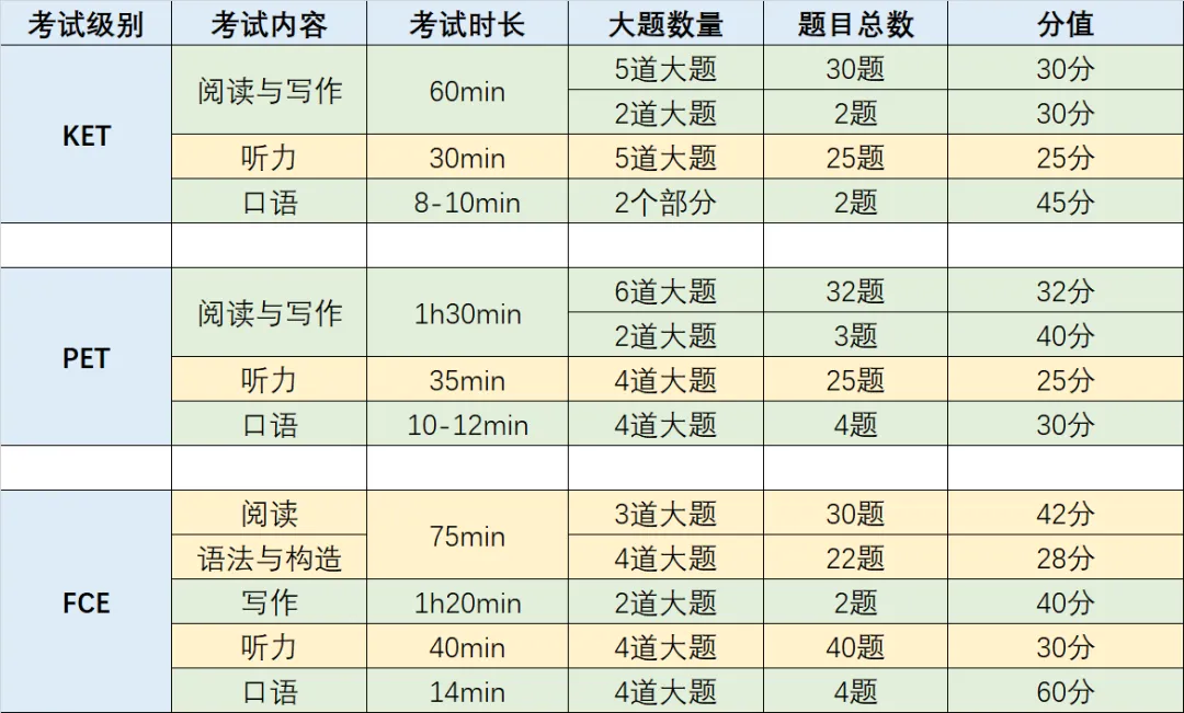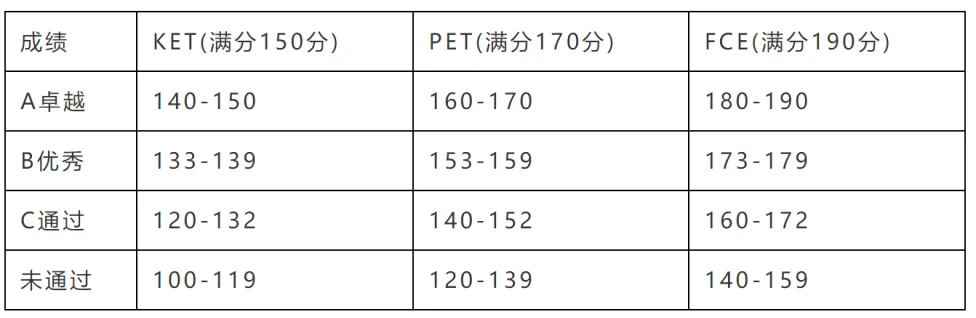 其中,KET通过需最低达120分,PET通过需最低达140分,FCE通过需最低达160分,达到最低通过分数即可获得相应的成绩证书。