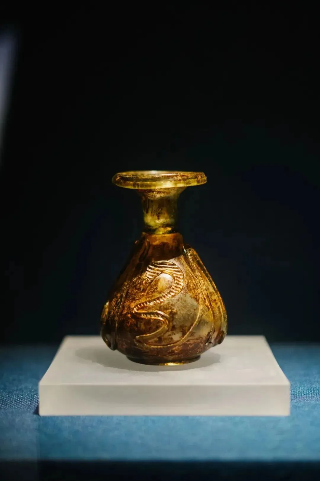 这个美轮美奂的梨形玻璃瓶,同样来自叙利亚,1600年前的叙利亚。