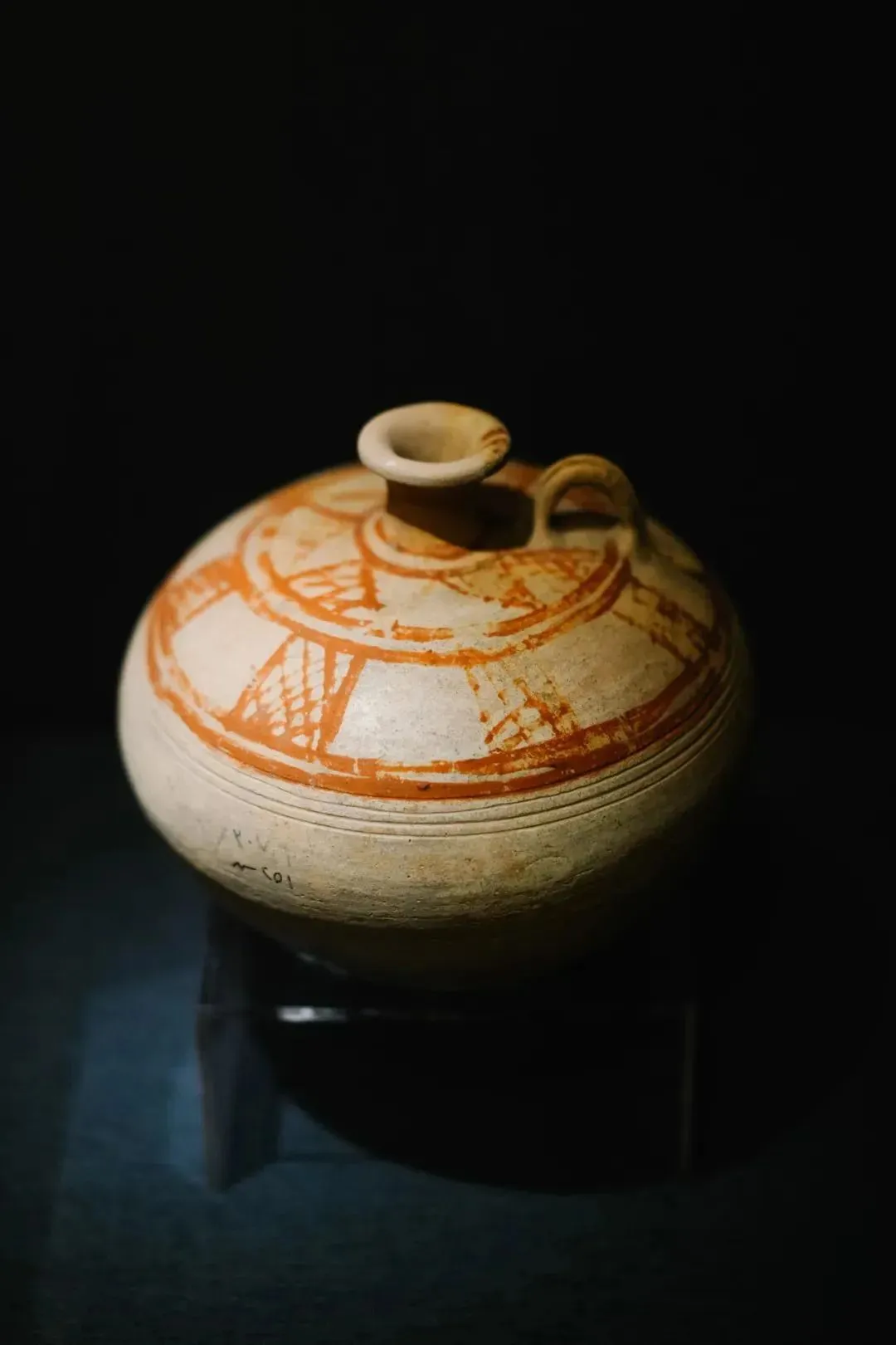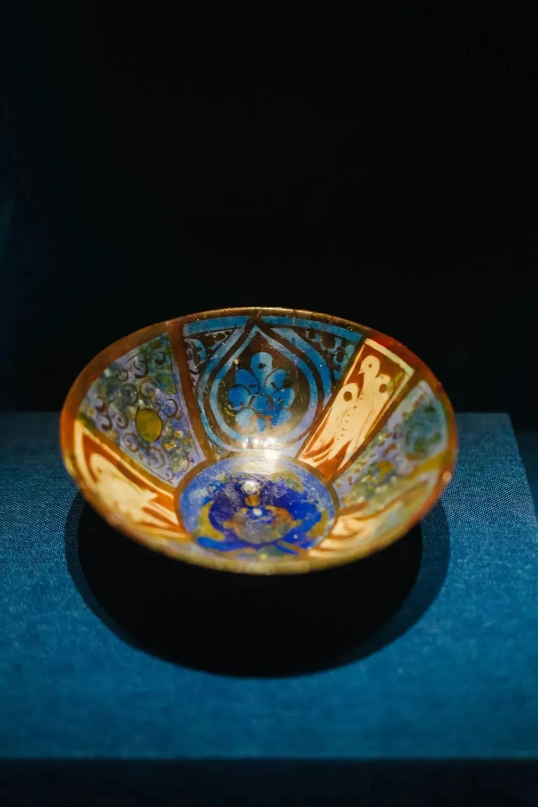 比如这只色彩迷人的釉陶碗,碗中绘有动物和植物纹饰且写有一种奇特文字。