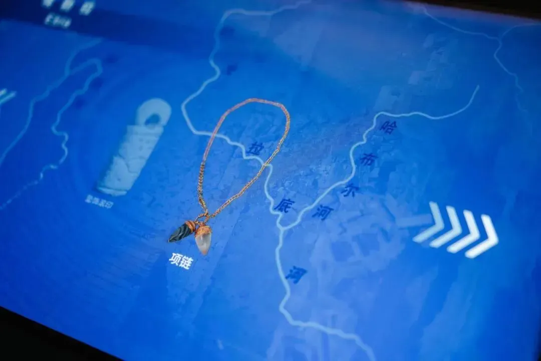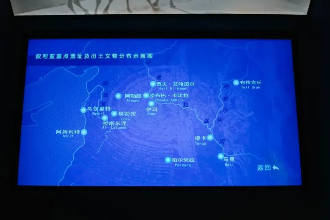 为了方便你直观感受到地域对叙利亚文明形成的强大引力作用,在展厅的出口附近,南京城墙博物馆特别设计了一块互动屏幕,只需要点击地点,就会出现该地点出土的文物。