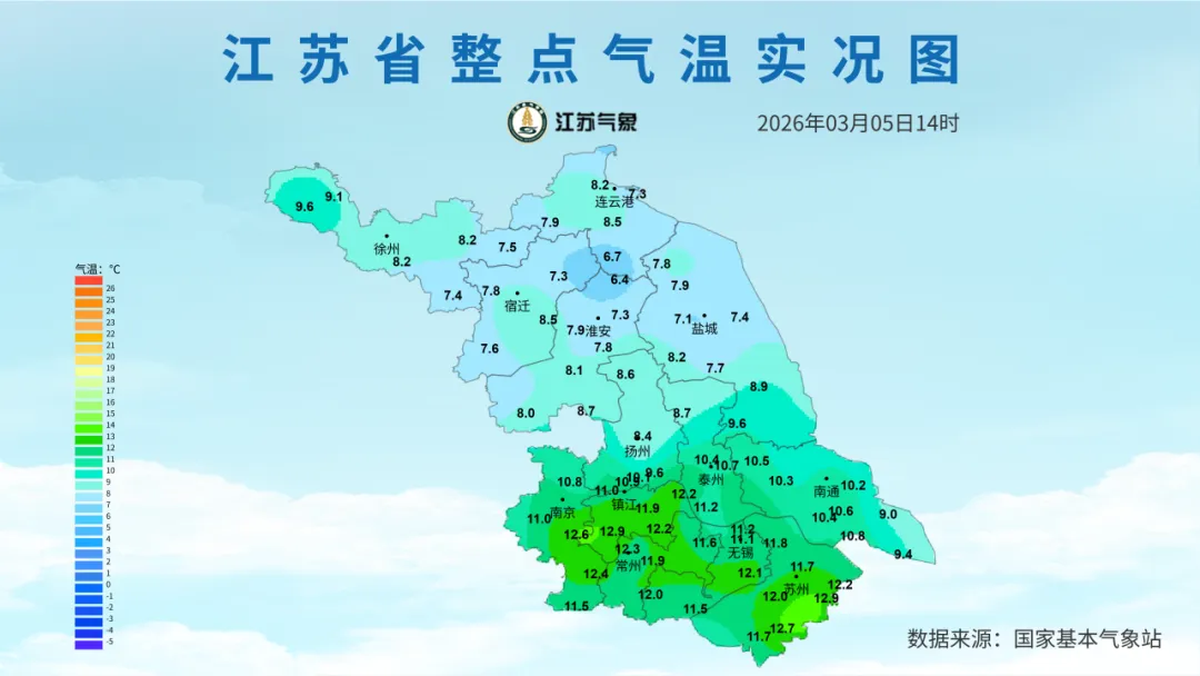 全省多云。最高温度:苏南地区13~14℃,其他地区11~12℃;最低温度:苏南地区3℃左右,本省东北部地区-2~-1℃,其他地区1℃左右。全省偏东风4-5级。