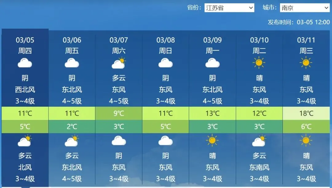 本省东南部地区阴有时有小雨,其他地区阴转多云。最高温度:本省东北部地区7℃左右,苏南地区13~14℃,其他地区9~10℃;最低温度:苏南地区5℃左右,本省东北部地区0~1℃,其他地区2~3℃。全省偏北风4级左右转偏东风4-5级阵风6级。