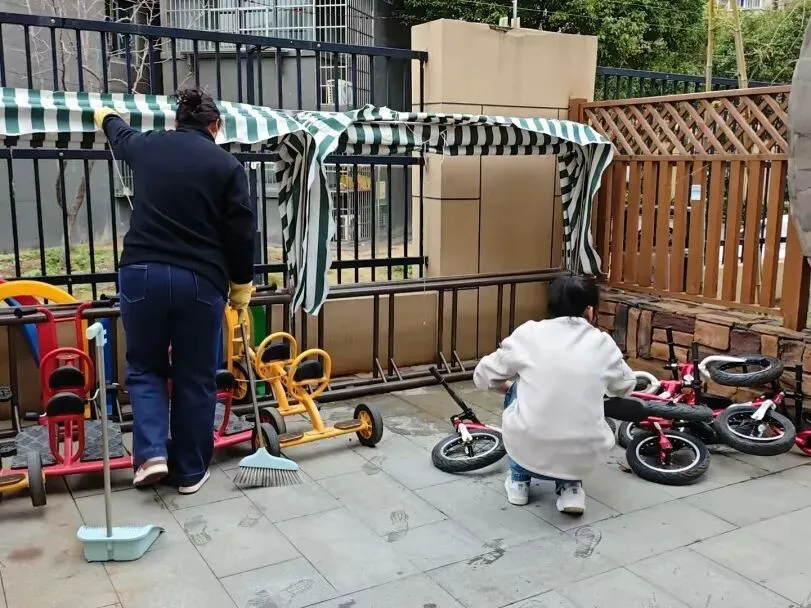 一举一动皆美好,一事一物皆整洁。幼儿园全体教职工分工明确、协同配合,严格按照卫生消毒管理标准,对班级、区域及户外场地等进行全方位、无死角的清扫与消毒。同时,园部特邀专业资质团队入园开展全面清洗消杀、巡检工作,以扎实举措筑牢校园防线,用心迎接孩子们归来。