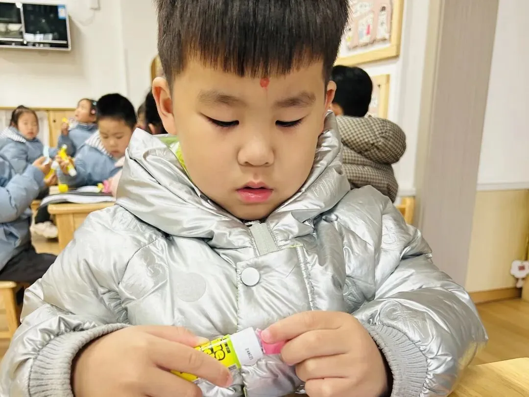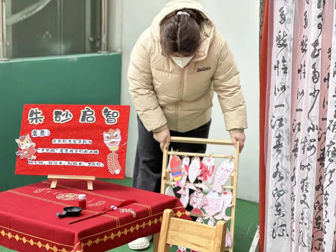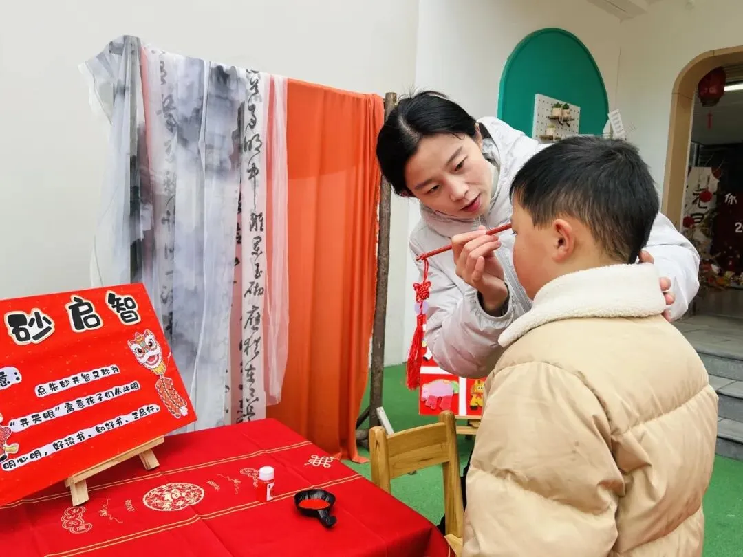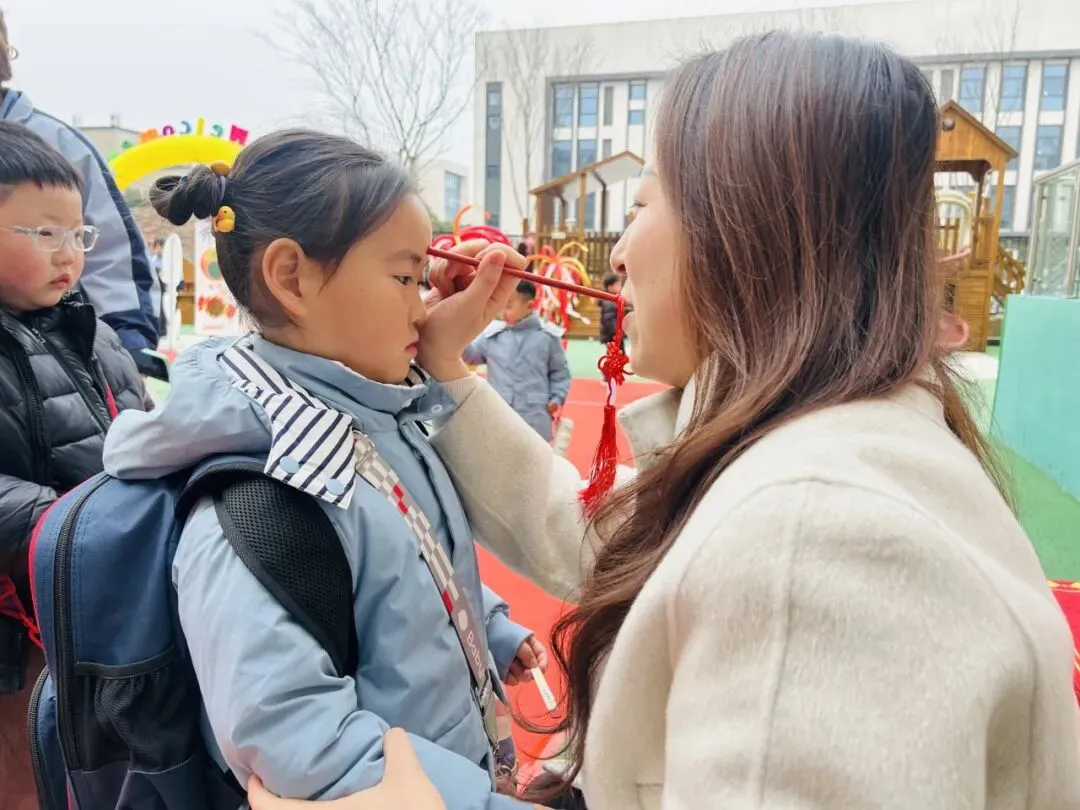 园长姐姐和糖果姐姐为每一位宝贝轻点朱砂,在额头留下红红的印记,这一抹朱砂,是美好的祝福,更是开启智慧的象征,愿宝贝们在新学期眼明心亮,乐学善思。