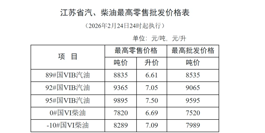根据国家发展改革委公布的国内成品油价格调价信息,现将我省汽、柴油最高零售、批发价格公布如下,自2026年2月24日24时起执行。