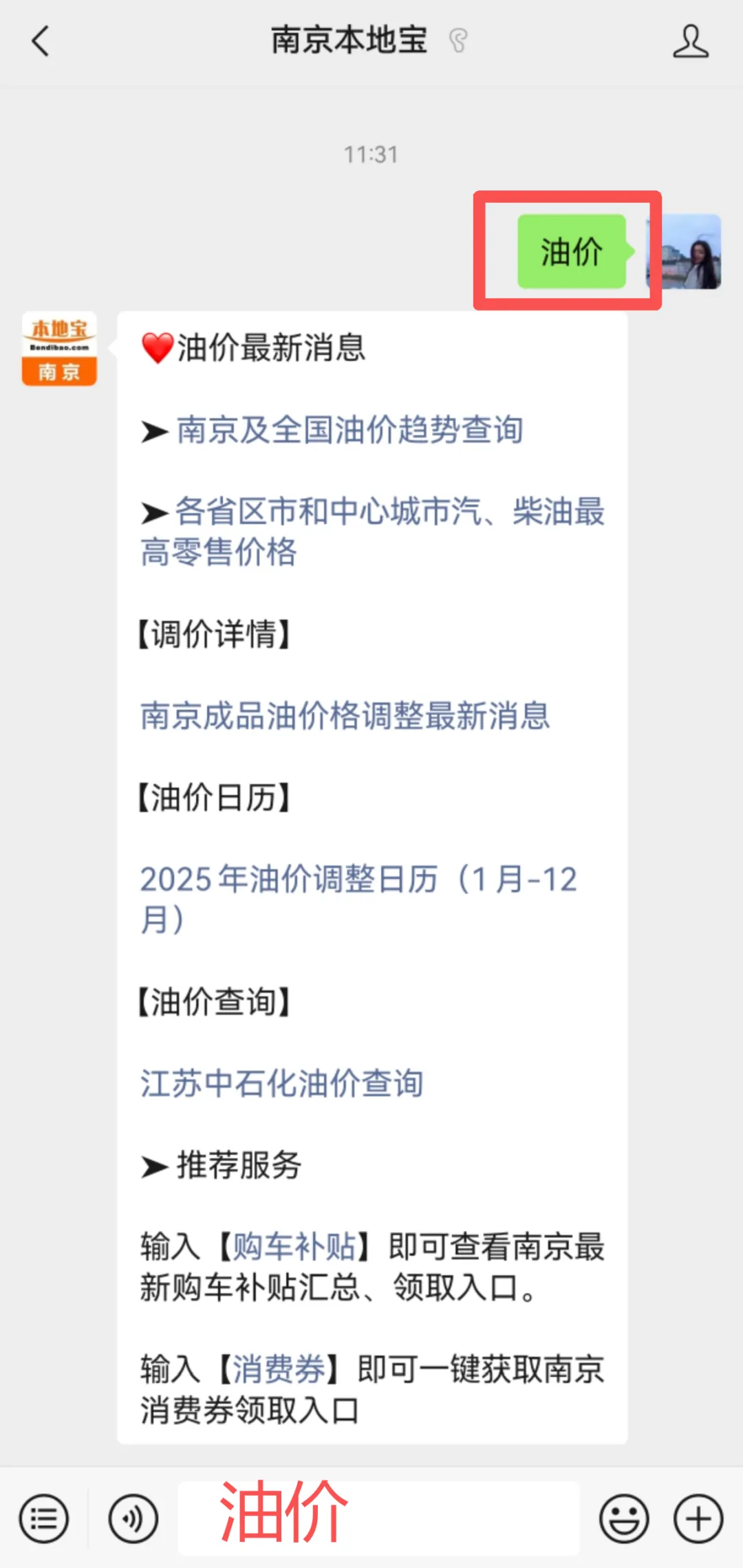 长按识别下方二维码,进入【南京本地宝】公众号,在微信后台对话框对话框回复【油价】即可快速进入南京油价查询入口、最新油价变动通知等。