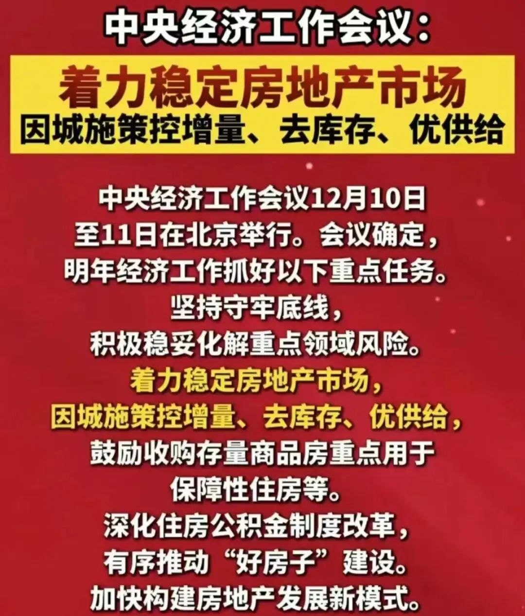 “着力稳定房地产市场。因城施策控增量、去库存、优供给,探索多渠道盘活存量商品房,鼓励收购存量商品房重点用于保障性住房等。”
