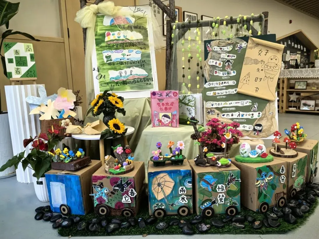 清晨,老师们早已在门厅等候。以“开往春天的列车”为主题的门厅春景,配上春天的小诗、节气插画和孩子们的美术作品,整个幼儿园被春天的气息轻轻唤醒。