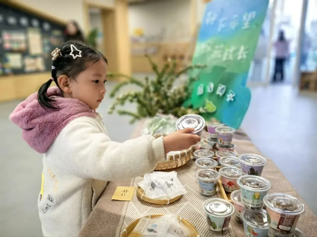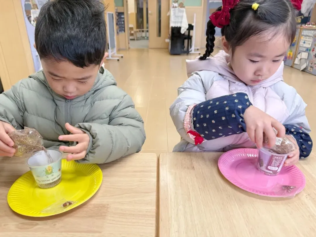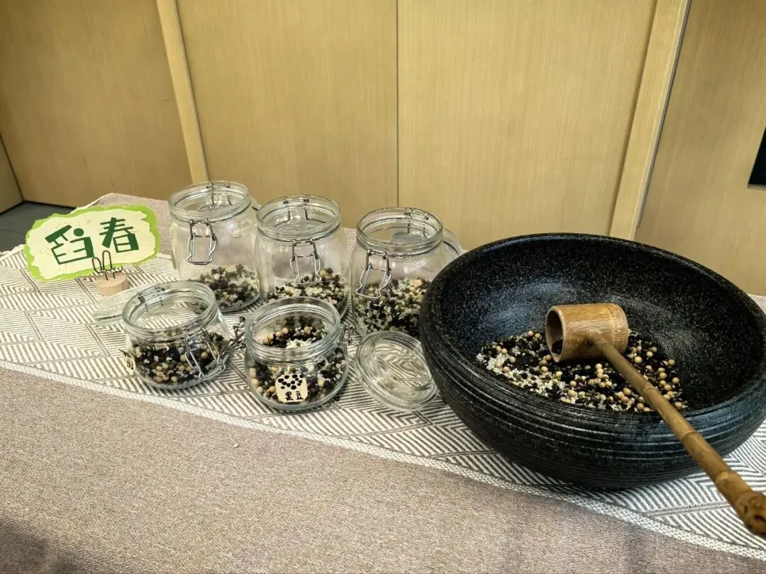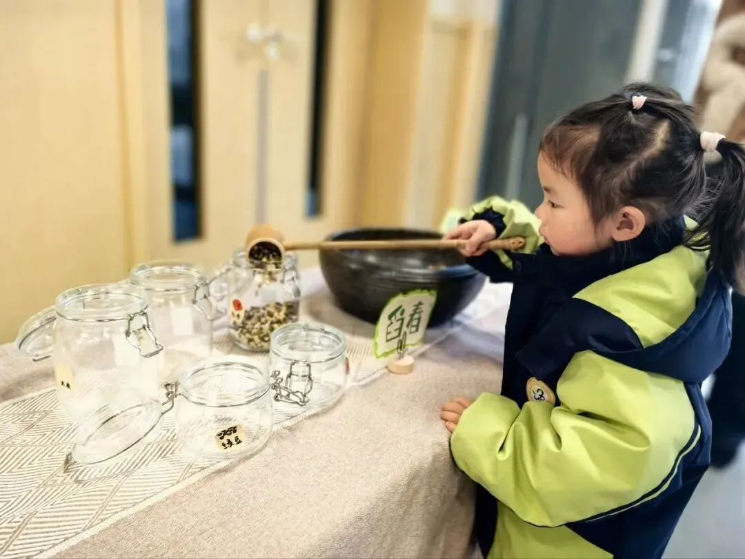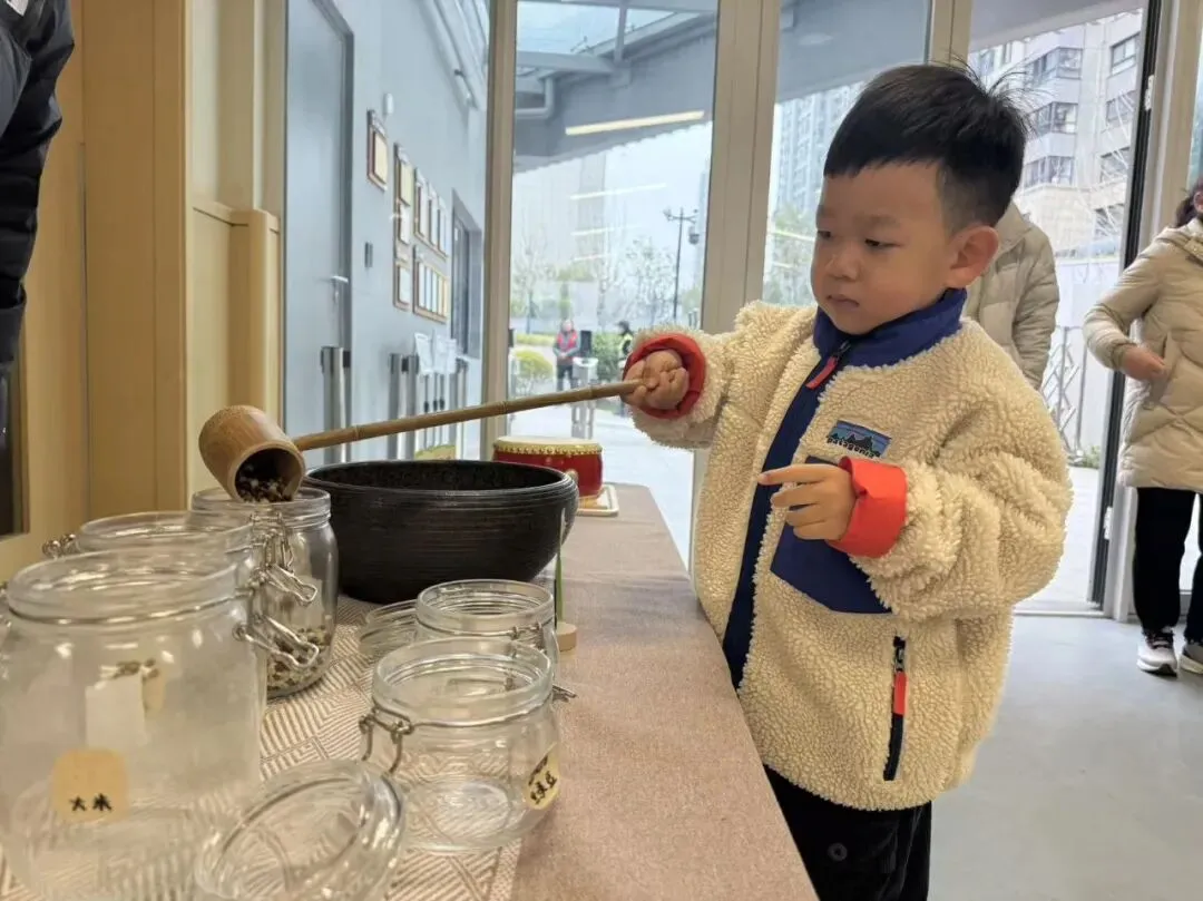 长桌上摆满了黄豆、绿豆、红豆、黑米和大米,孩子们用小勺轻轻舀起,将它们装进瓶中。每一粒豆米,都是舀起春天的美好,每一个小瓶,都装满了对新学期的期待。