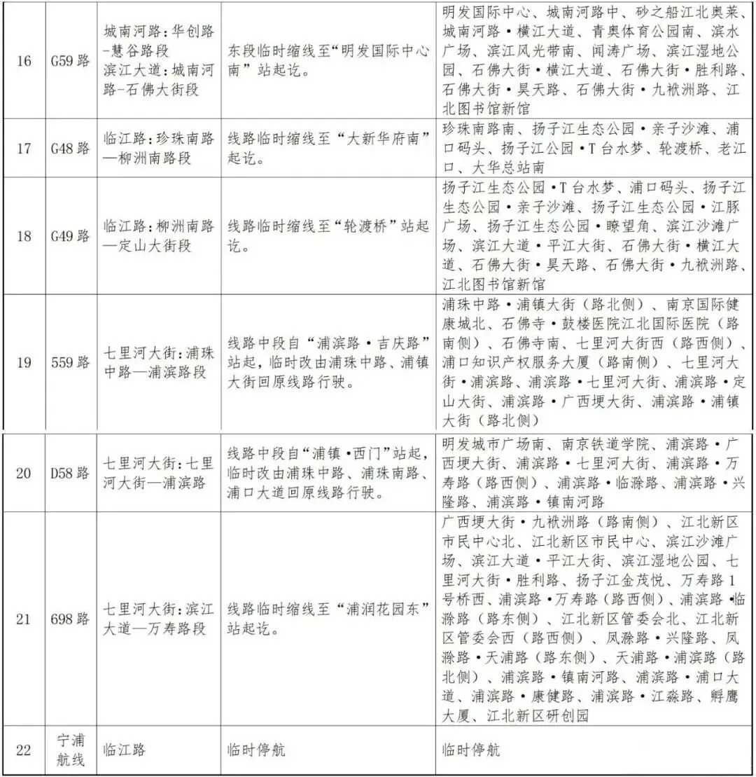 2026南京北岸马拉松将于2026年3月8日07:00-14:00在南京市江北新区举行。为确保赛事安全、有序开展,结合公安交管道路管控方案,此期间赛事线路涉及的相关道路采取分时分段封闭的交通管制措施。届时公交509路、510路等21条线路及1条轮渡航线采取临时缩线、绕行、停运等措施,待赛事结束后所涉及线路即恢复原线运行,并对外公示。具体见附表: