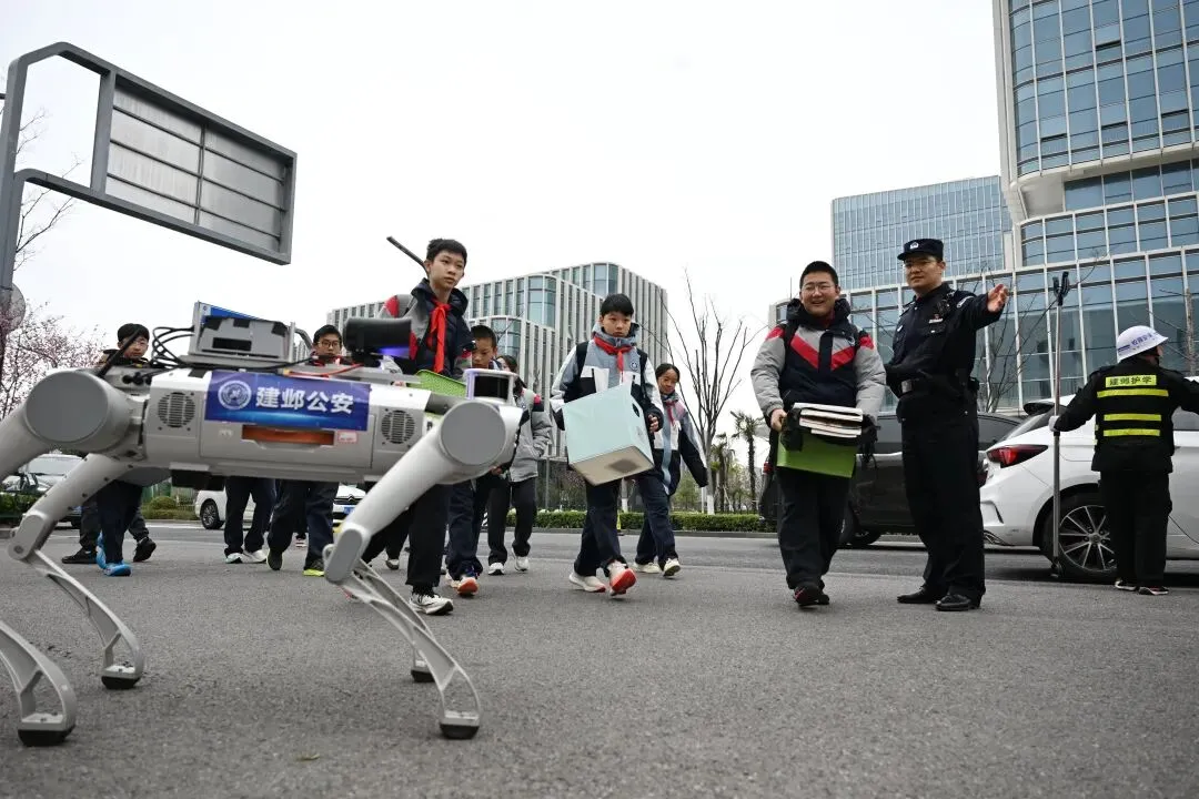 开学首日,建邺分局创新运用机器狗,参与护学工作 国武/摄