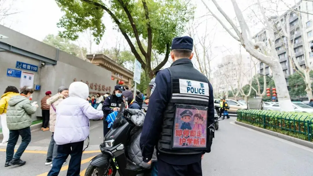 玄武分局将多功能护学马甲升级变身为校园“移动安全站”。开学前夕,玄武分局专门将护学岗民警执勤背心升级为集宣传、指挥、警示、服务于一体的智能装备。通过升级,使得背心可动态显示“即停即走”“紧急避让”等指令及反诈、防欺凌标语,辅助高峰疏导;遇突发情况一键切换红蓝爆闪,起到警示震慑作用。目前,该执勤背心正在逐步推广使用,已成为护学岗上流动的“安全名片”。