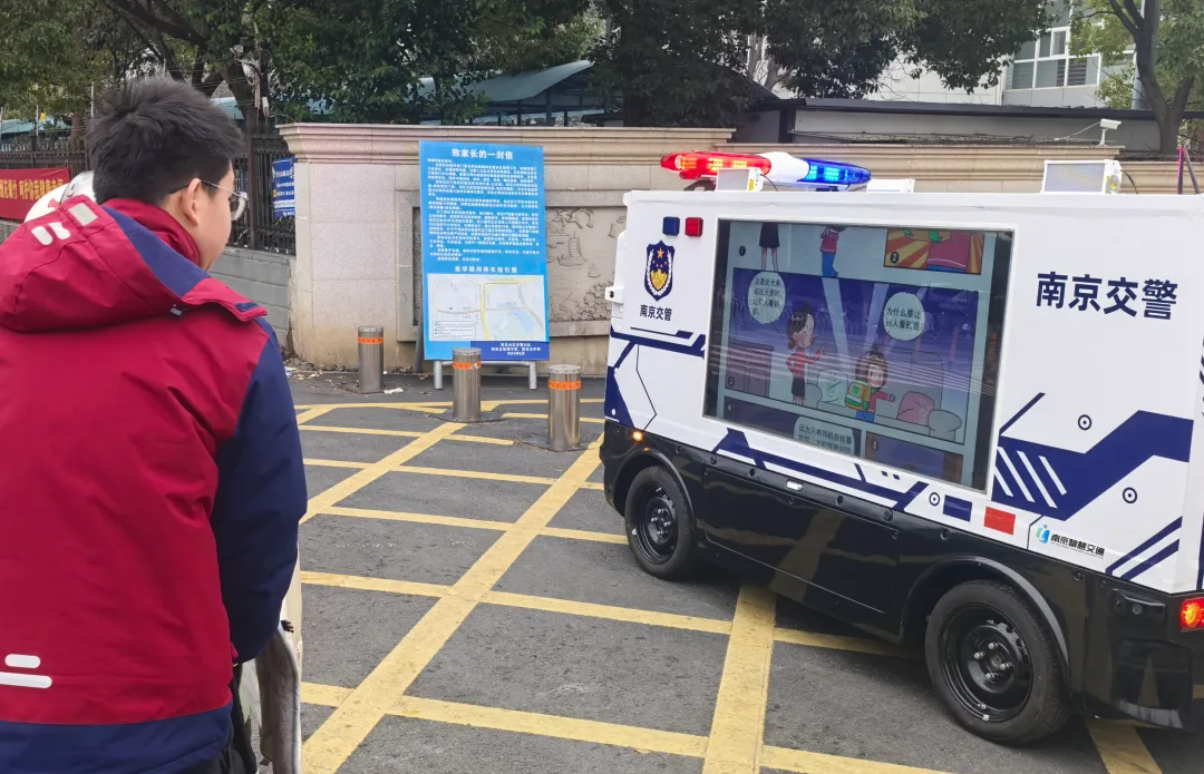 “同学们请注意,过马路不追逐打闹,乘电动自行车需戴头盔。”3月5日上午,“警小宁”智能巡逻车开启交通安全宣传互动模式,车载大屏滚动播放中小学生安全出行动画视频,并播报语音提示,不少家长驻足观看。在巡逻车上方,“金陵飞鹰”无人机时而悬停喊话、时而拉高俯瞰,为校园周边交通出行提供直观视角和空中巡管。