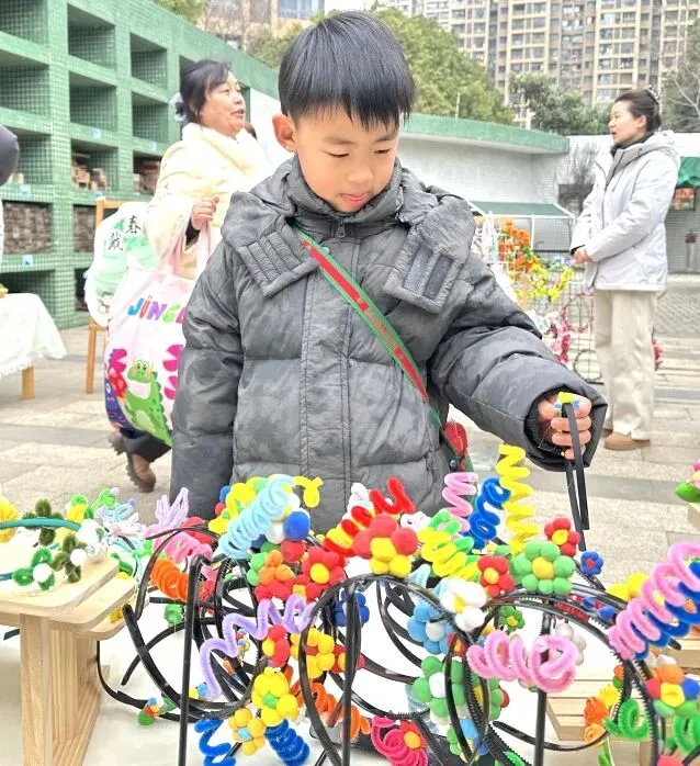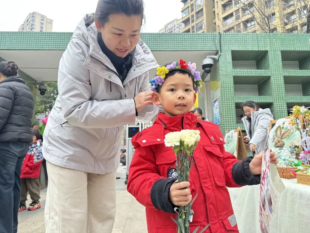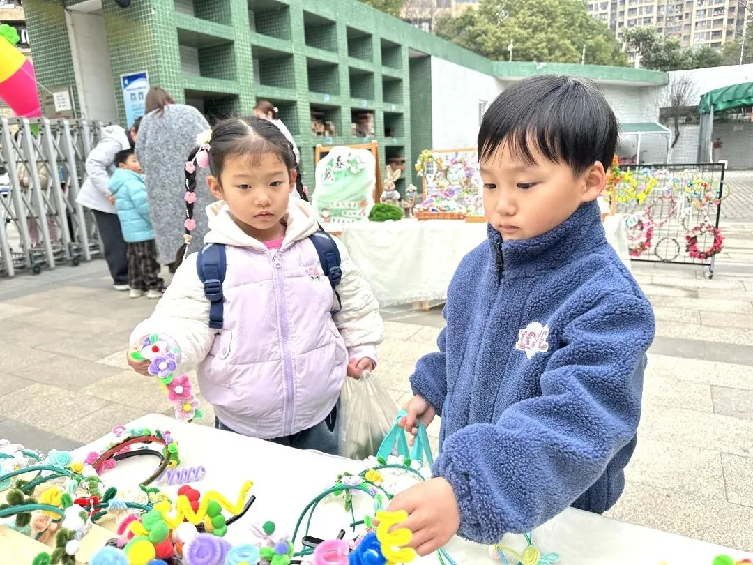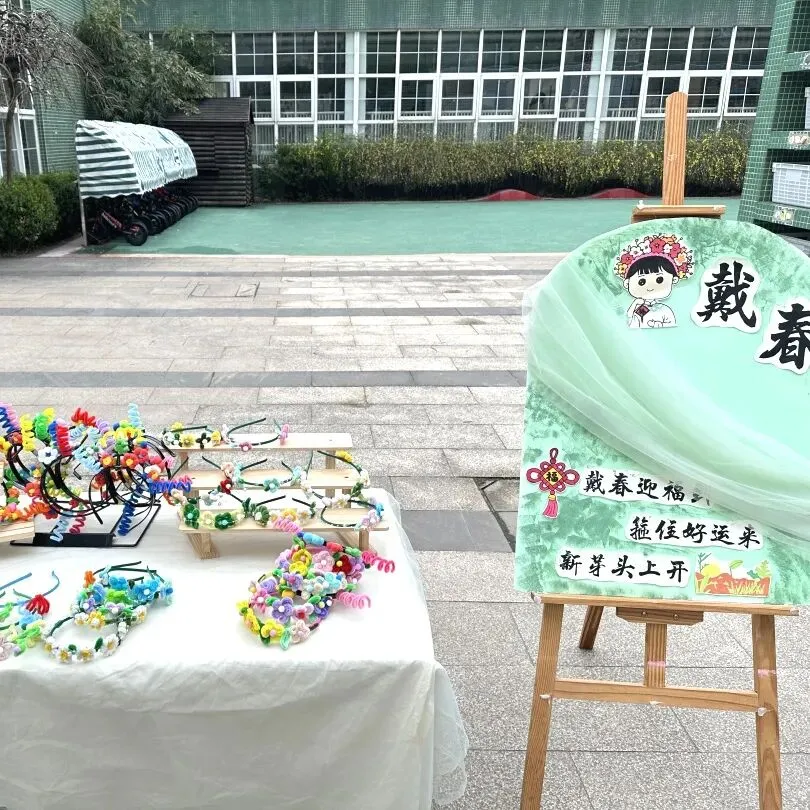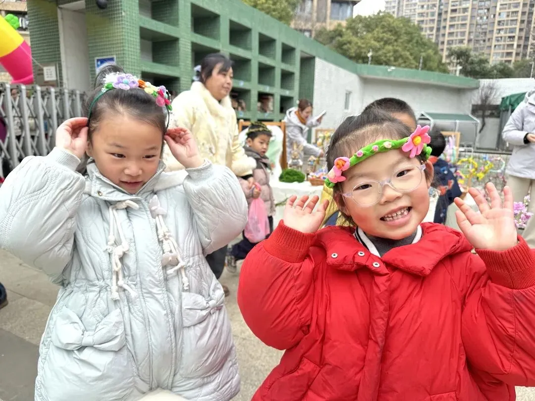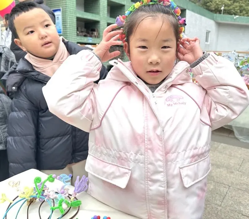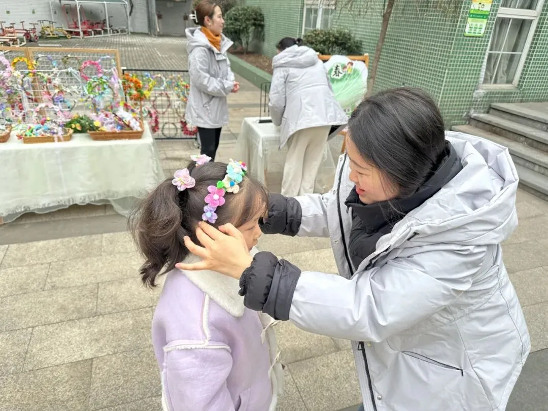 小班幼儿佩戴着用彩色丝带、干花、卡通春芽贴纸编织的“春之信物”手腕花,粉色丝带点缀其间,寓意“把春天的爱戴在手上”;中班幼儿手持用废旧材料制作的花环,亮片、毛根、毛球装饰的花环独一无二,是幼儿亲手打造的春日美好;大班哥哥姐姐则自主设计春日发箍,创意十足的造型彰显着成长的个性,每一款发箍都藏着对春日的畅想。
