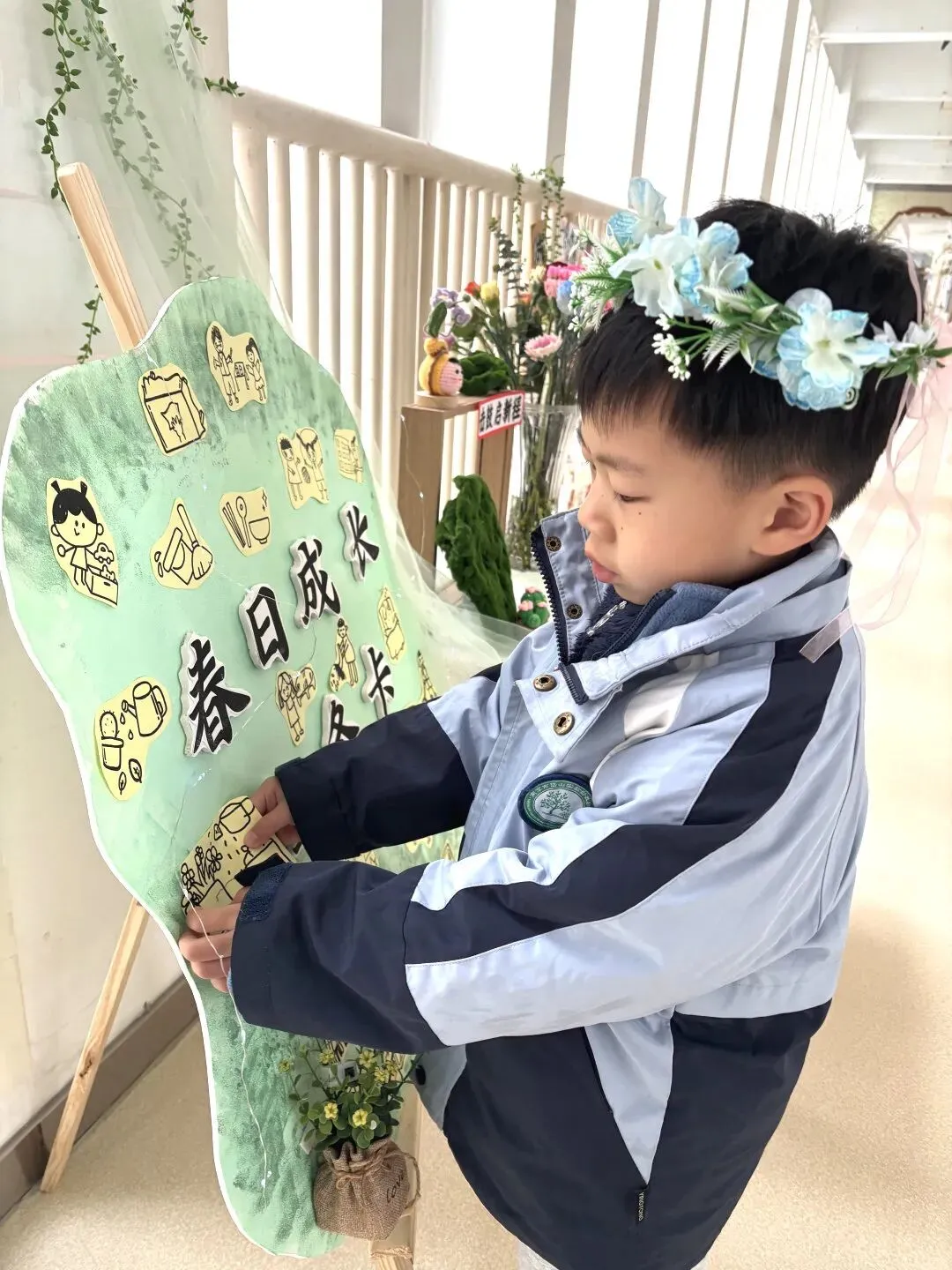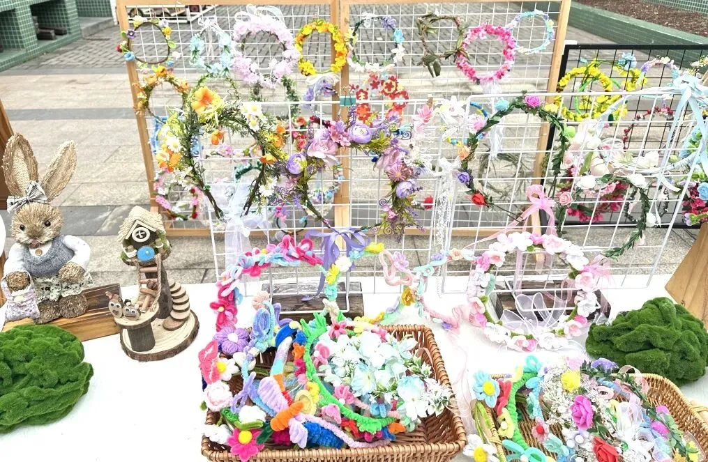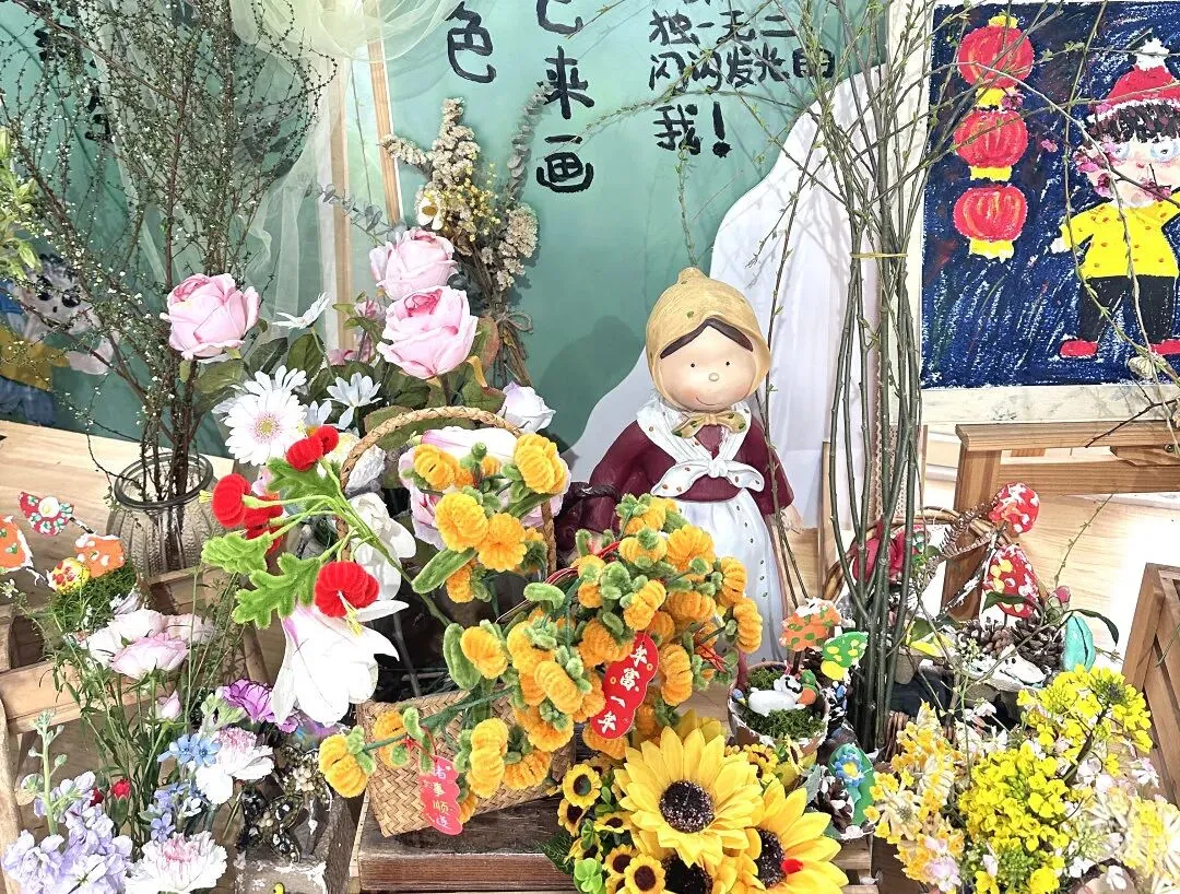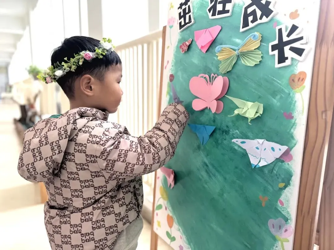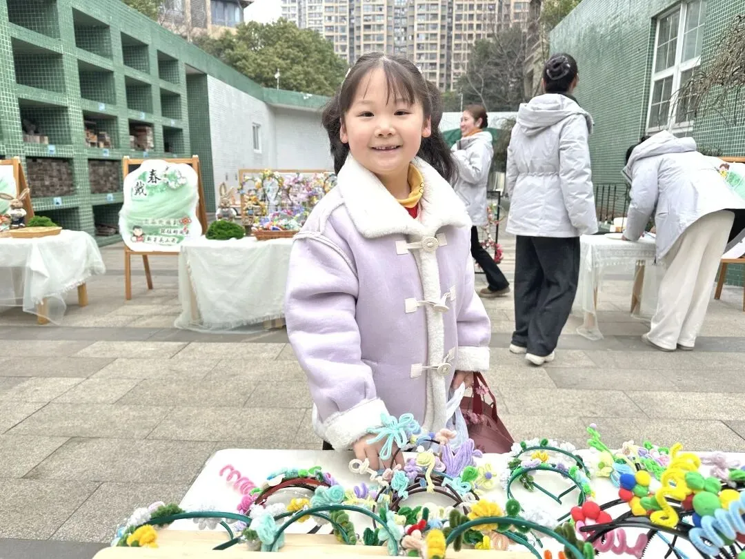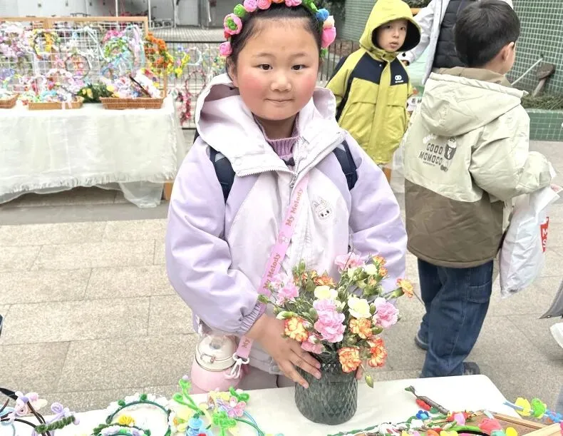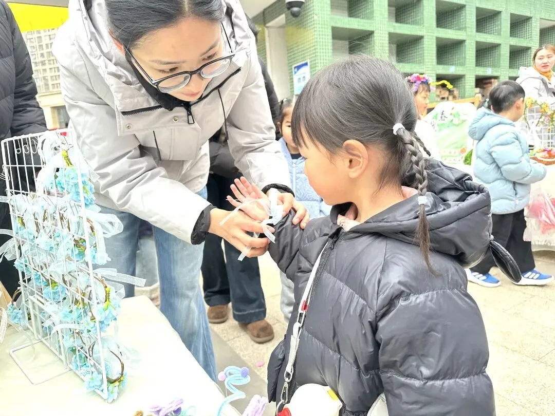 小班幼儿佩戴着用彩色丝带、干花、卡通春芽贴纸编织的“春之信物”手腕花,粉色丝带点缀其间,寓意“把春天的爱戴在手上”;中班幼儿手持用废旧材料制作的花环,亮片、毛根、毛球装饰的花环独一无二,是幼儿亲手打造的春日美好;大班哥哥姐姐则自主设计春日发箍,创意十足的造型彰显着成长的个性,每一款发箍都藏着对春日的畅想。