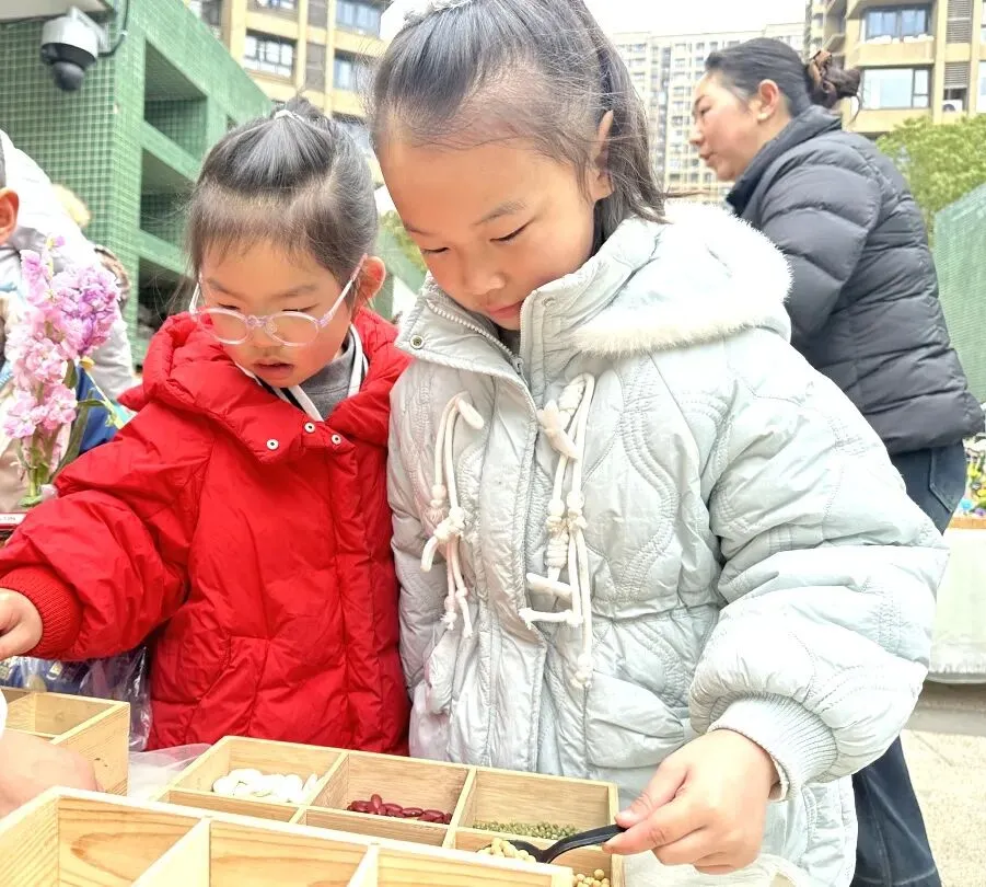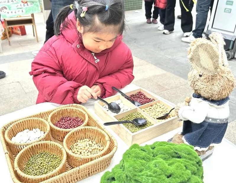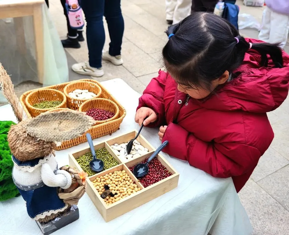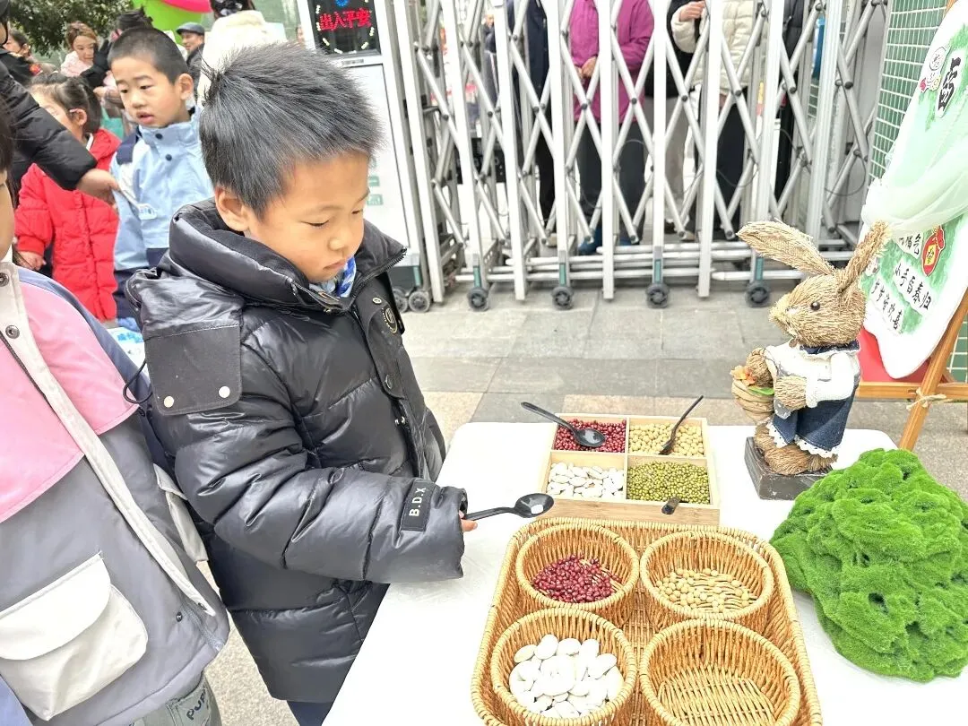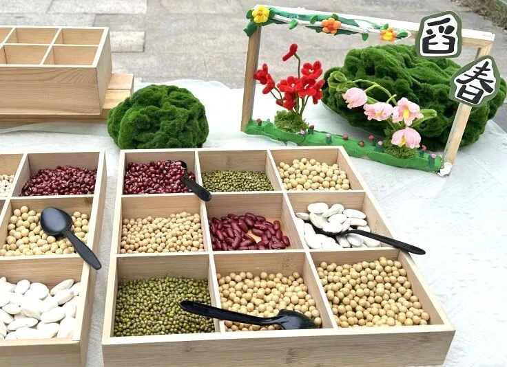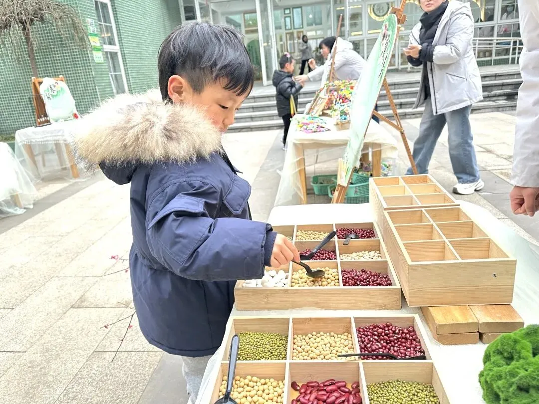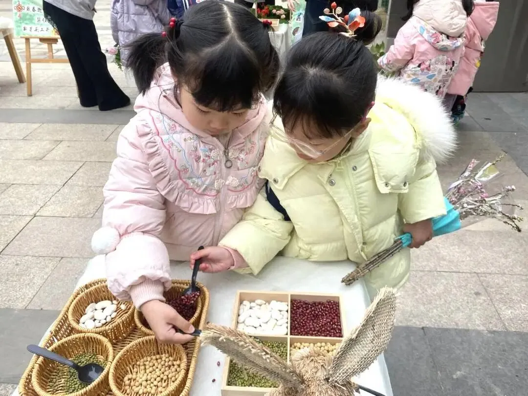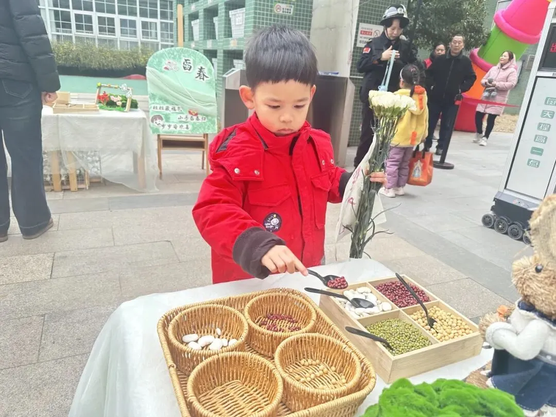 首先映入眼帘的是“舀春”仪式。木框里盛满绿豆、黄豆、红豆等各色春日种子。幼儿手持小巧的勺子,小心翼翼地舀起一勺种子放入框中。一颗颗饱满的种子既承载着春日的希望,也寓意着他们在新学期能如种子般蓬勃生长,在幼儿园的沃土中汲取养分,向阳而生。