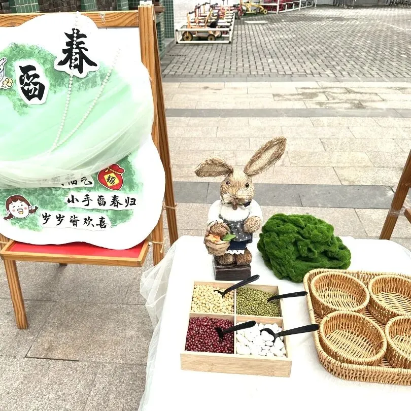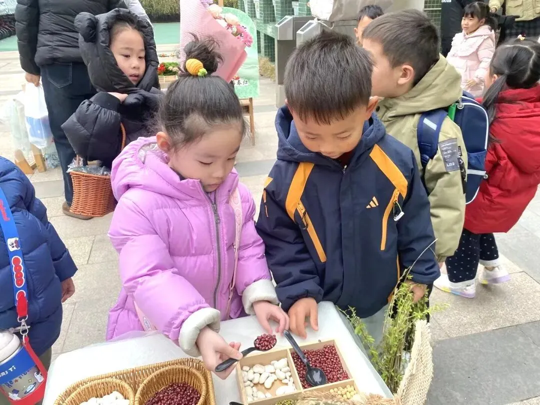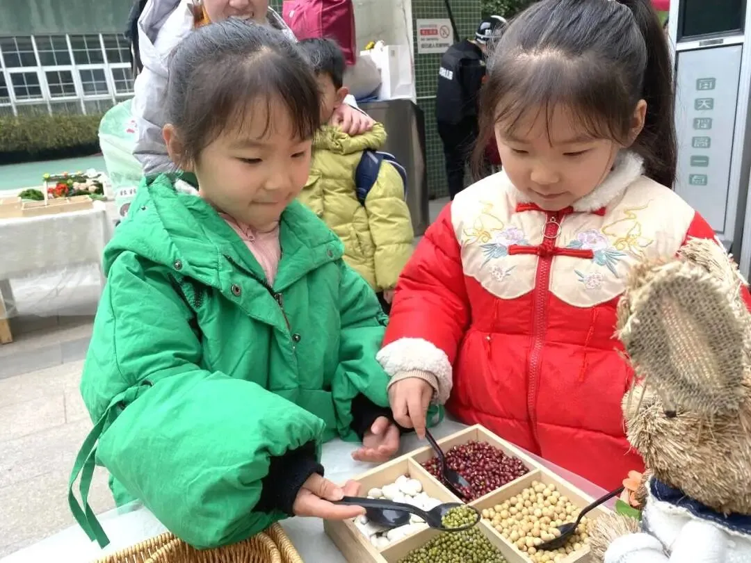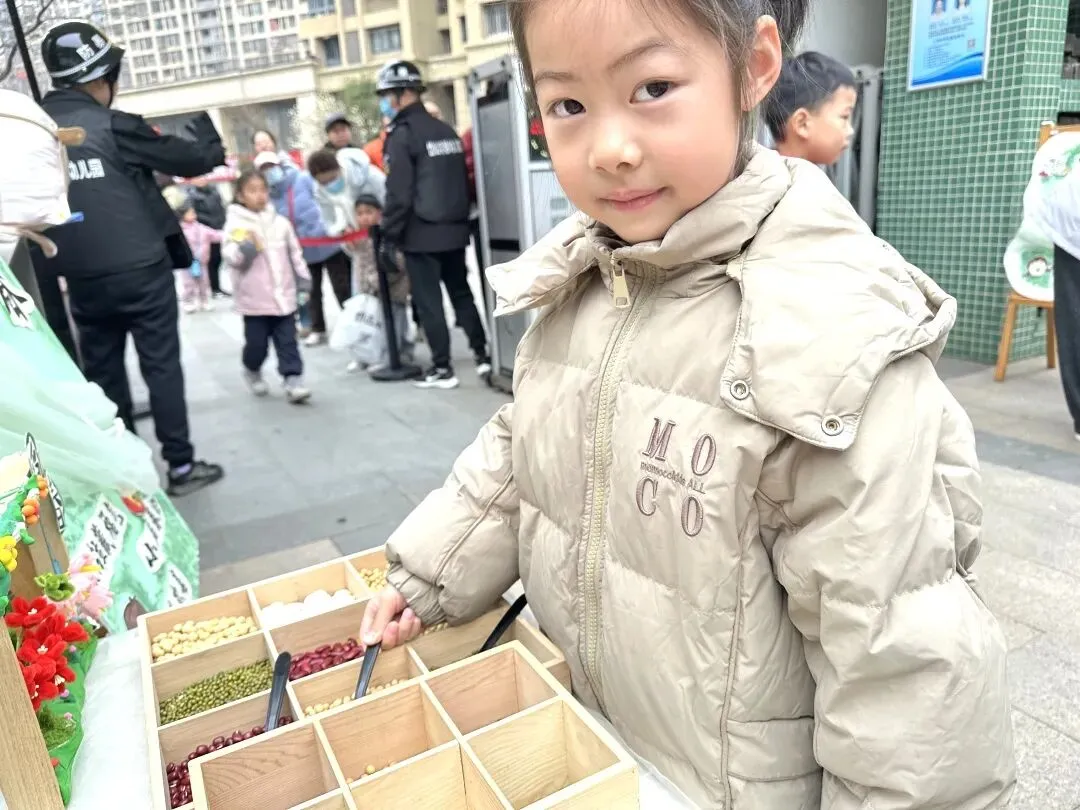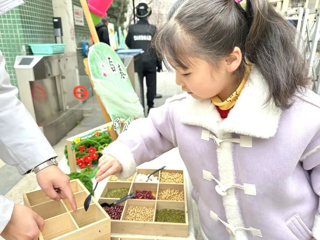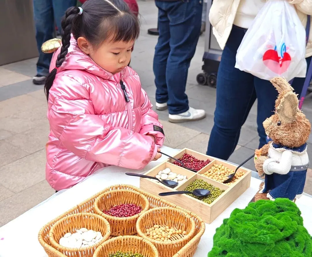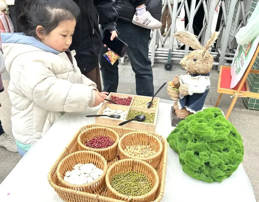 首先映入眼帘的是“舀春”仪式。木框里盛满绿豆、黄豆、红豆等各色春日种子。幼儿手持小巧的勺子,小心翼翼地舀起一勺种子放入框中。一颗颗饱满的种子既承载着春日的希望,也寓意着他们在新学期能如种子般蓬勃生长,在幼儿园的沃土中汲取养分,向阳而生。