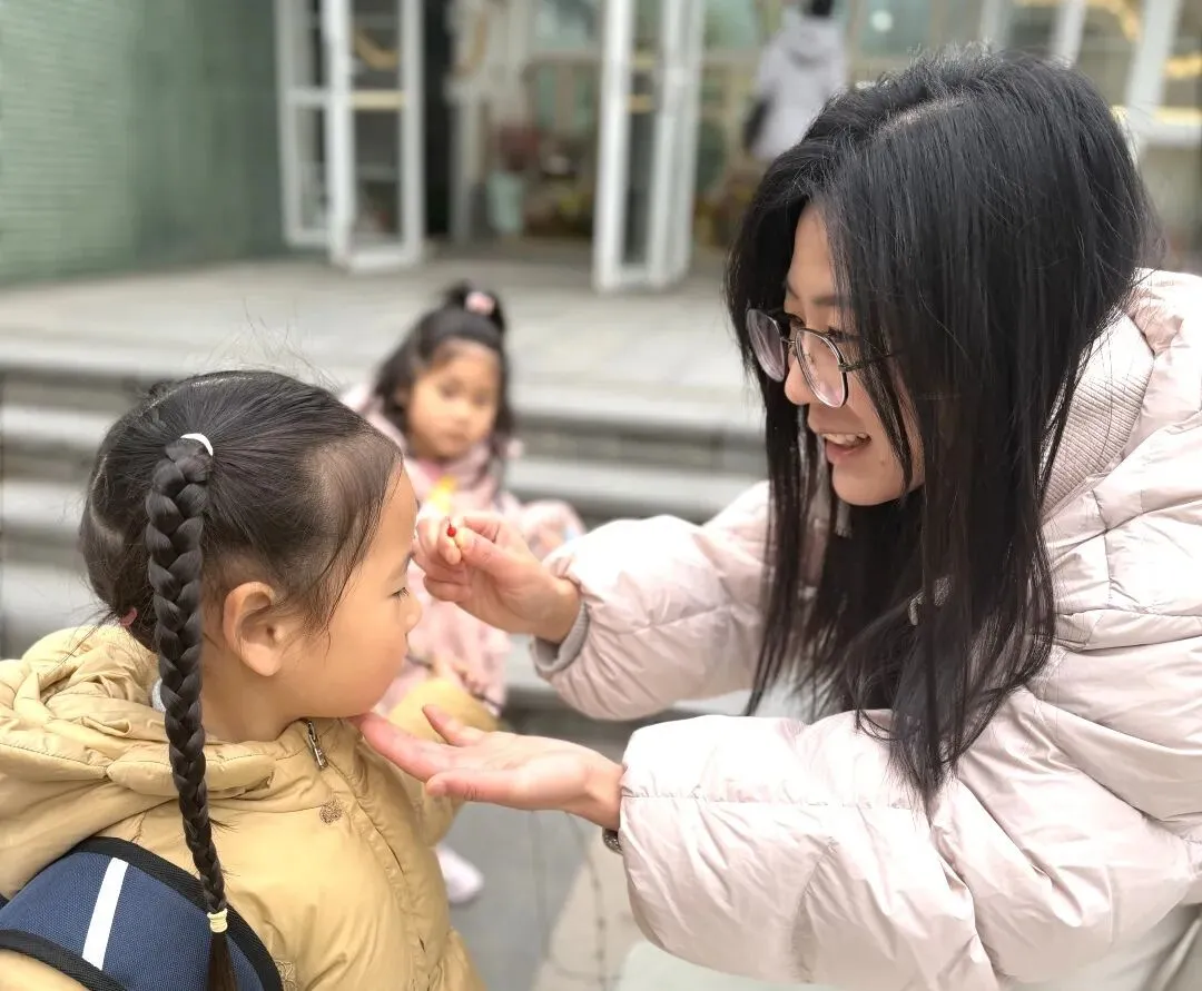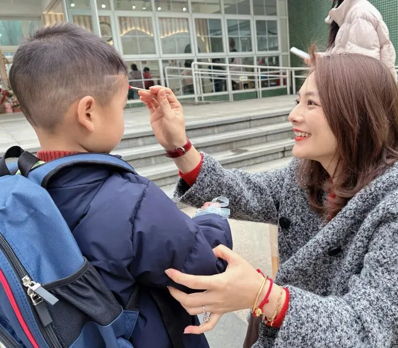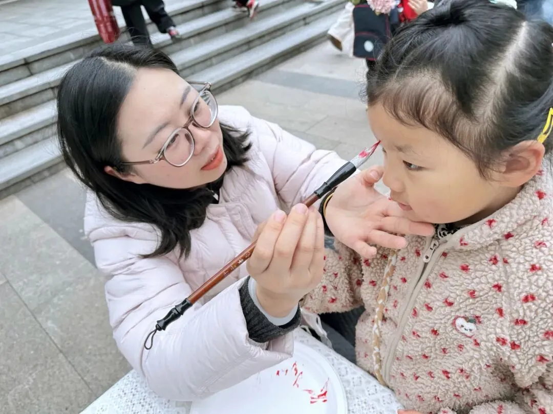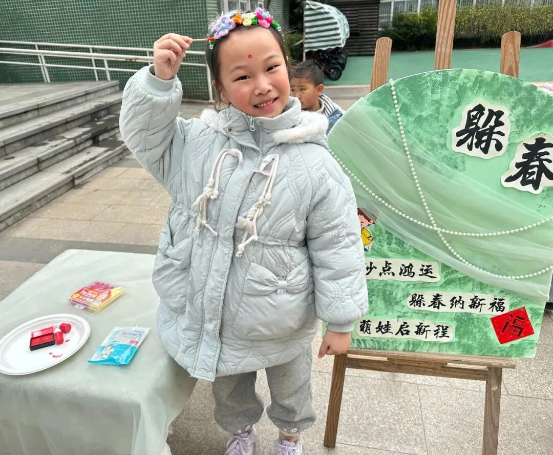 接着来到“躲春”环节,教师手持朱砂,为幼儿轻点额头。一抹鲜艳的红痣,是传统民俗的美好延续,更是老师对幼儿的真挚期许,寓意着朱砂启智、春日纳福。愿幼儿在新学期开启智慧之门,收获满满成长。