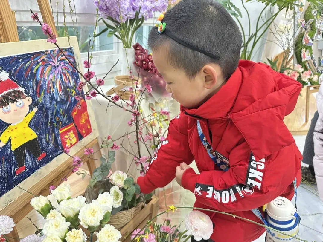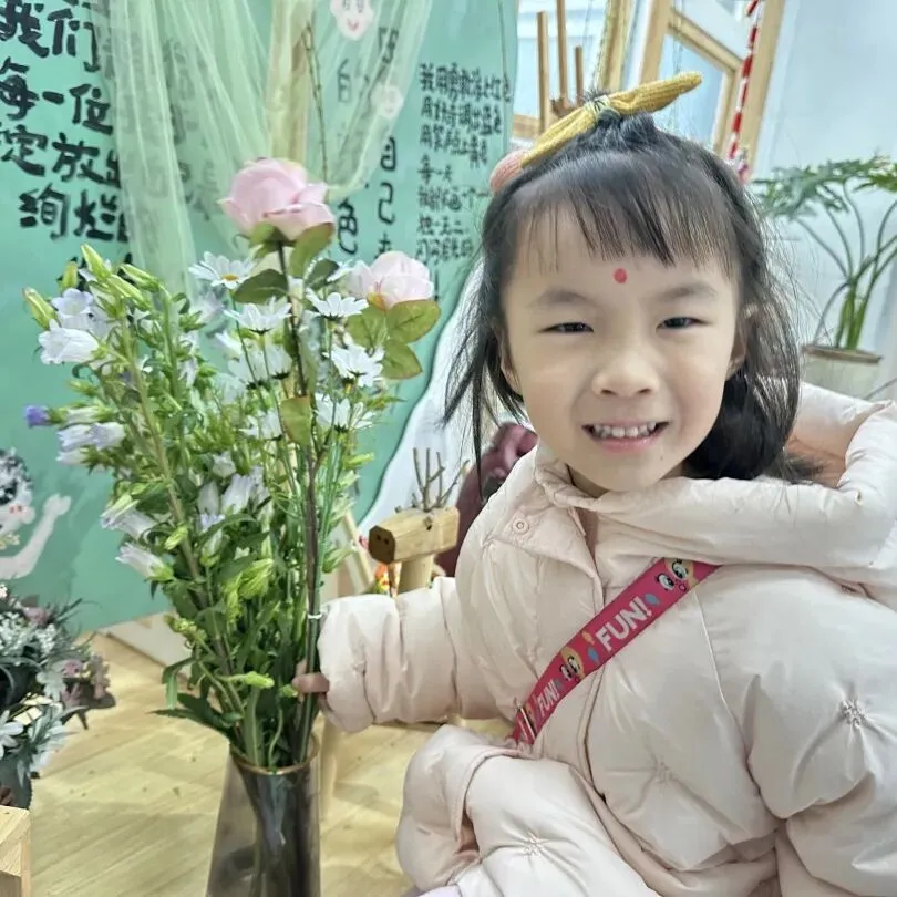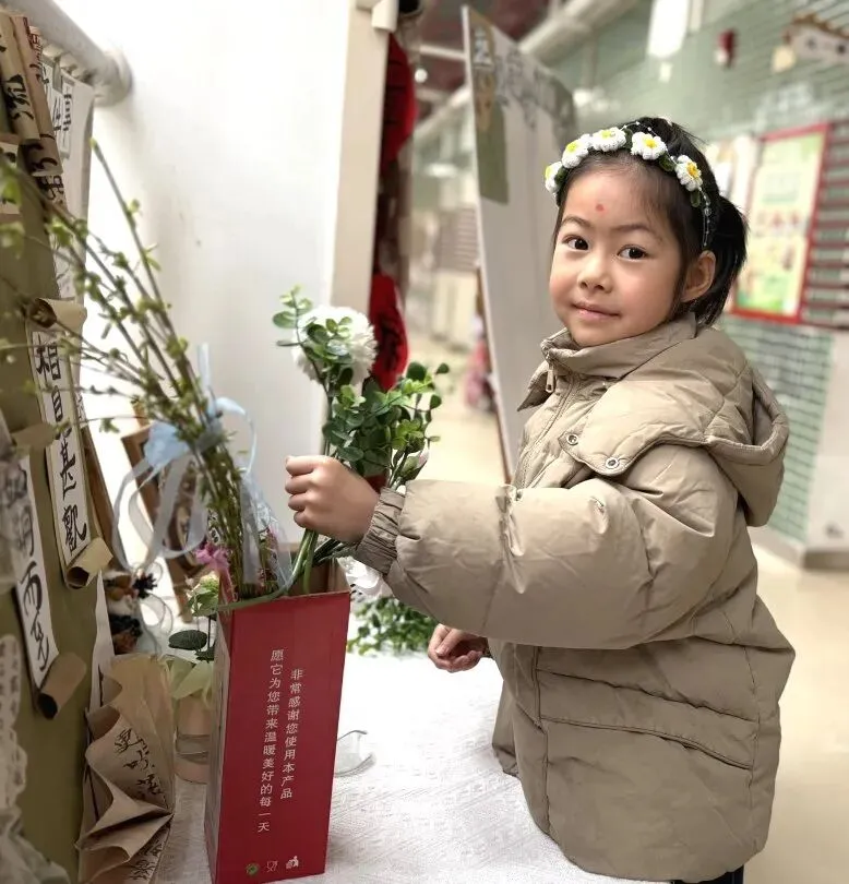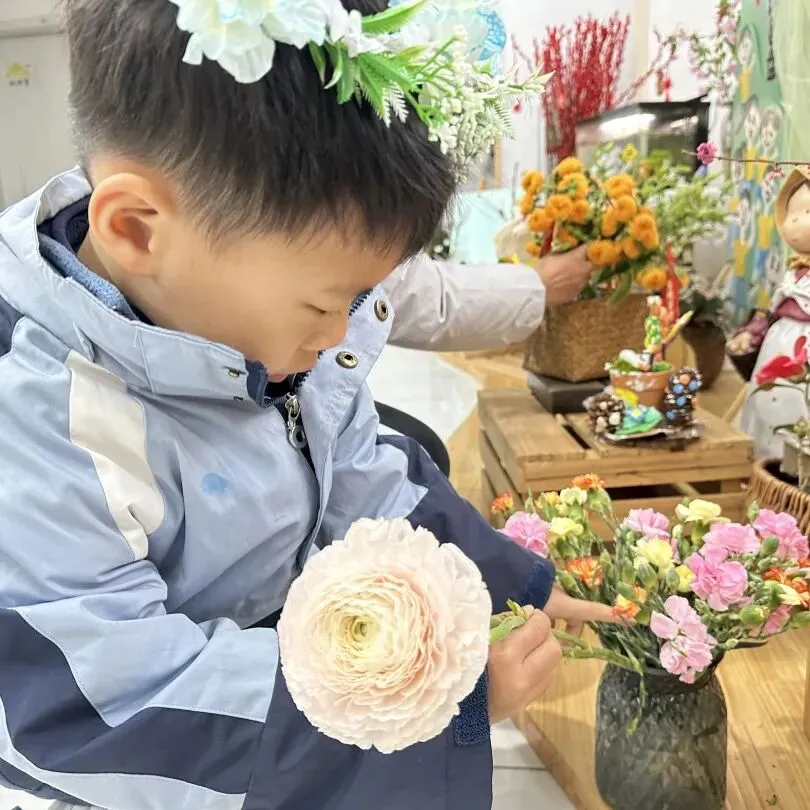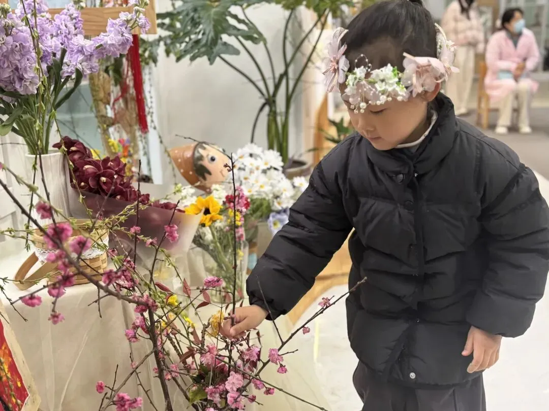 仪式最后,幼儿捧着鲜艳的花束、嫩绿的柳枝,认真地将花枝插进花瓶中。小手轻轻摆弄花枝,让春日的色彩绽放在校园的每一个角落。插春不仅让幼儿感受自然之美,更在动手操作中体会春日的生机,让“春”的美好扎根心底。