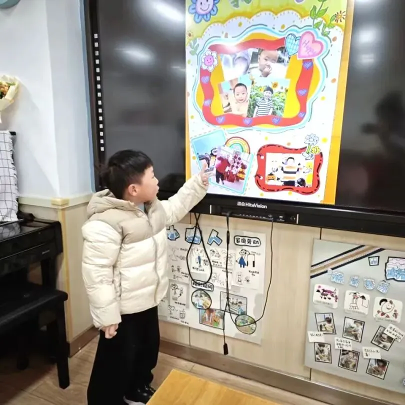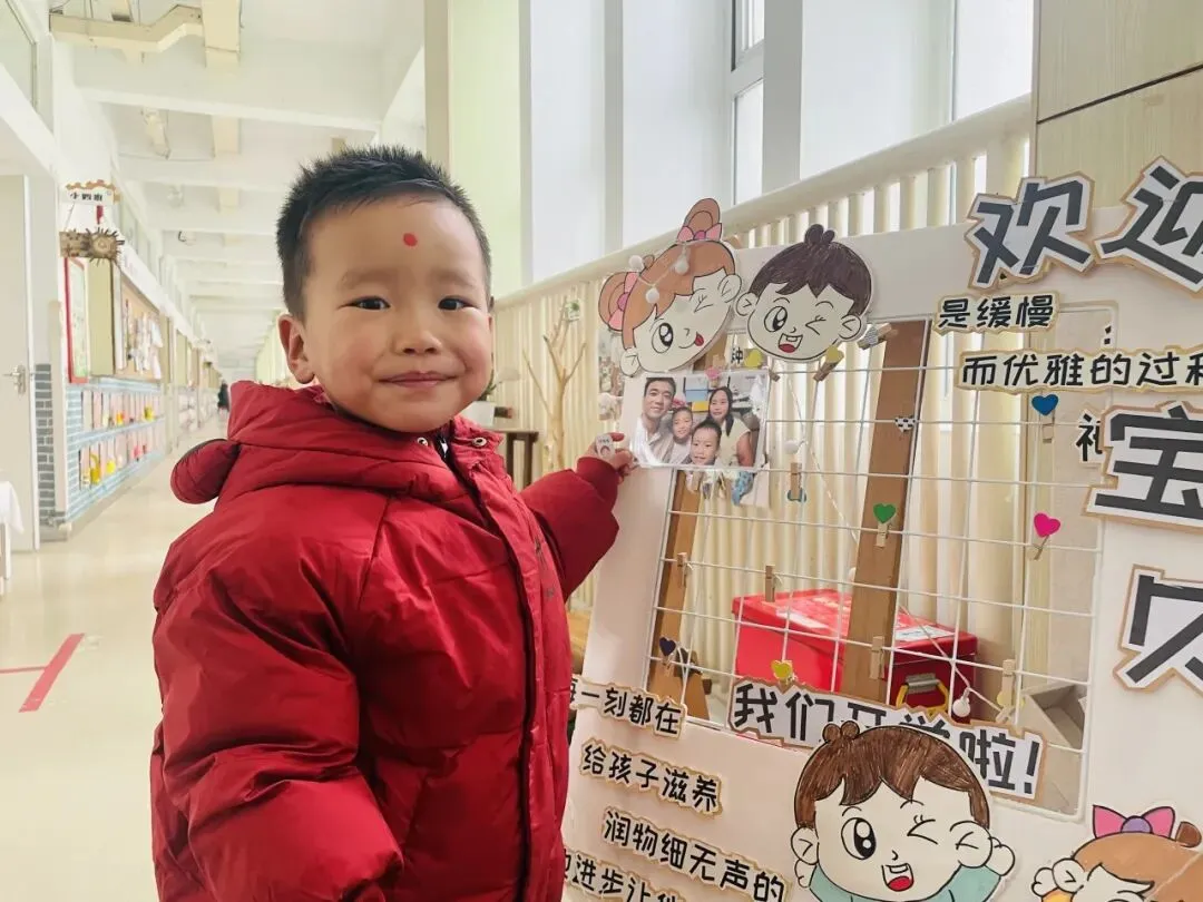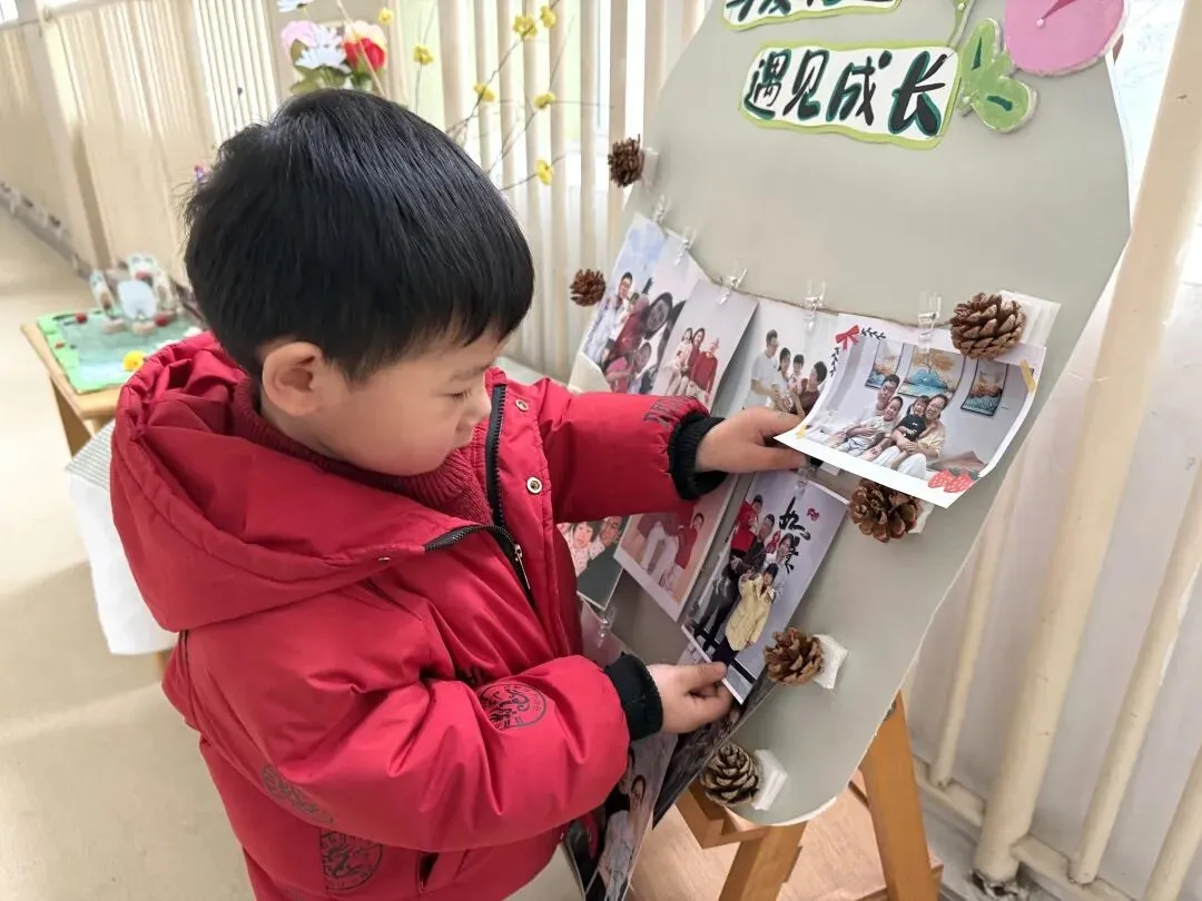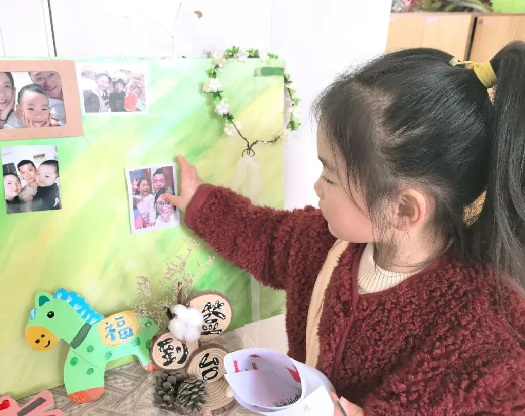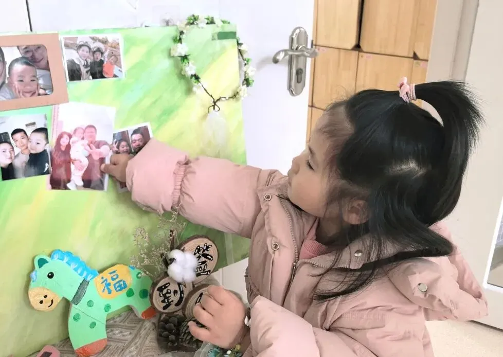 小班的幼儿带来了寒假的温暖记忆——全家福。在“我爱我的家”主题签到板前,他们认真印下小手印、画上小涂鸦,再把照片小心翼翼地夹上展示板。小小的仪式,满满的幸福。