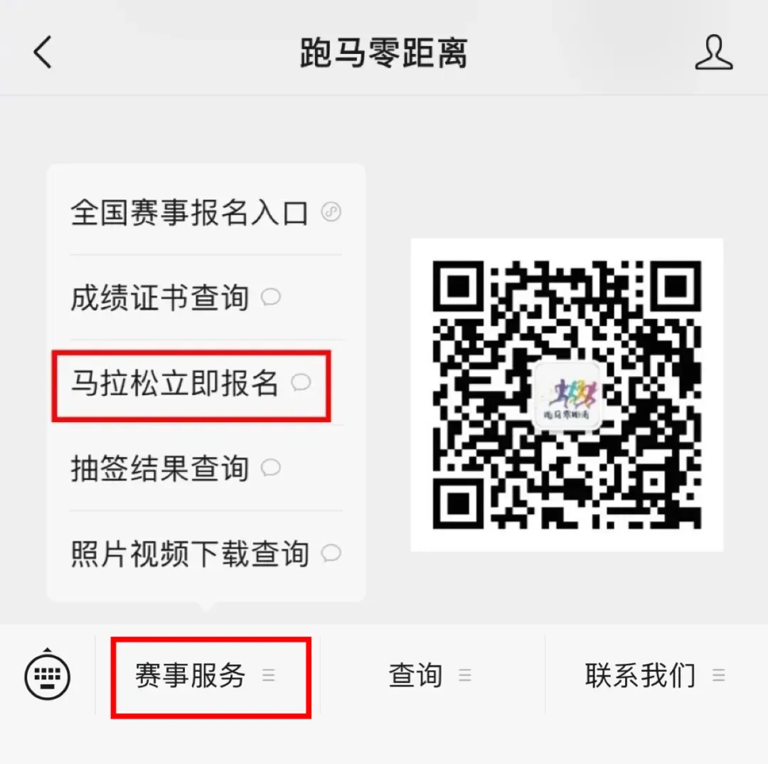 操作步骤:关注「跑马零距离」微信公众号→点击“赛事服务”→选择“马拉松立即报名”→点击对应赛事名称进行查询报名,或选择“全国赛事报名入口“进行对应小程序查询报名