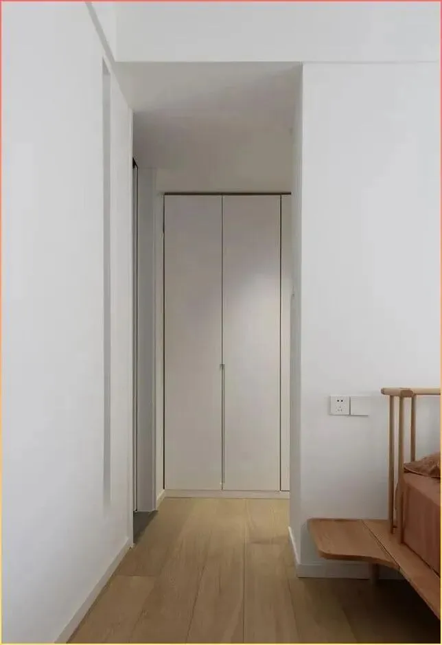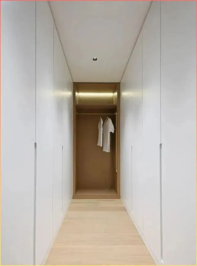 尽头处留了一个开放式的木色.挂.衣区,内.嵌灯带,瞬间打破了白色的单调,增加了一丝暖意。