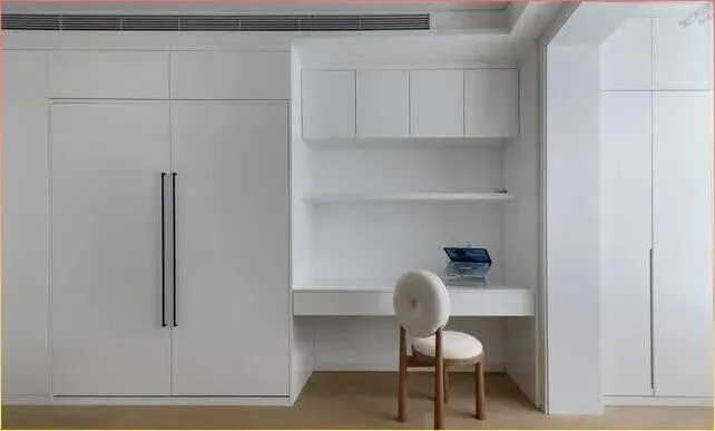 两侧全是顶天.立地.的白色.柜子,最绝的是.采用了无把手设计,关上门就像两堵白.墙,视觉.上极其整洁。