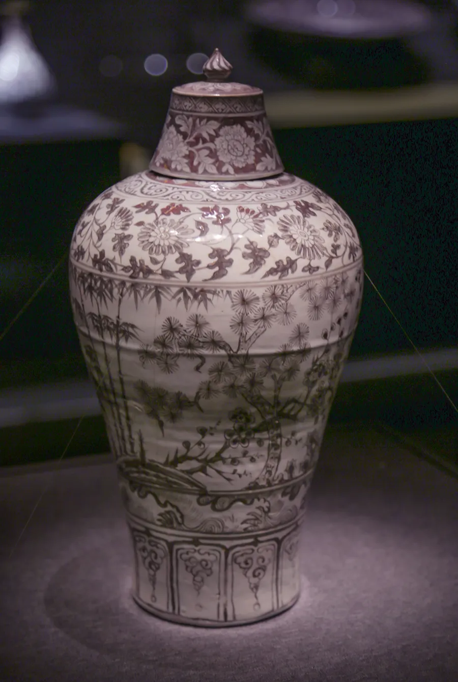洪武年间,朱元璋在景德镇设了御窑,开始烧制高温铜红釉,那时炉火温度还略差点,烧出来的“釉里红”发色偏暗,红得不够正,可毕竟是开山之作,产量又极少,能传下来的,件件都是名品。南京博物院有件镇馆之宝,叫“洪武 釉里红 岁寒三友图 梅瓶”,便是那时流传下来的好东西。上图:釉里红岁寒三友图梅瓶(盖完整)明 25年在南京博物院拍摄其实这只梅瓶是一对,另外一只就在南京市博物馆,也在这次特展上进行了展出,但因为缺了盖子,就不如南京博物院的那只有名。