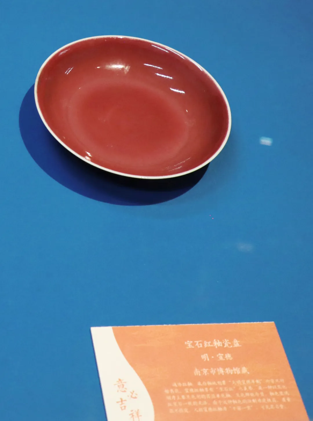 这其中,我最喜欢的还是那几件红釉瓷,宣德宝石红釉盘,色彩像凝住的晚霞,还有郎窑红瓷瓶和豇豆红太白尊等等,或热烈,或柔媚,在安静的展厅里每件都仔细看了半天,走开了,又忍不住绕回来看,真是打心眼里喜欢。上篇就先讲展览中的红釉瓷器。