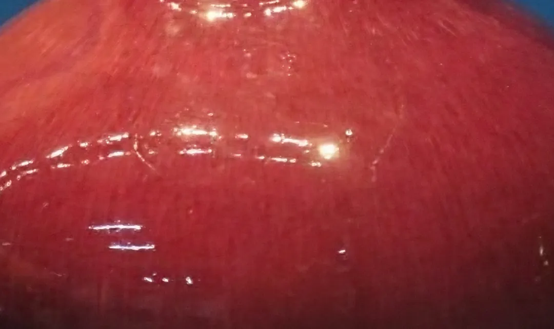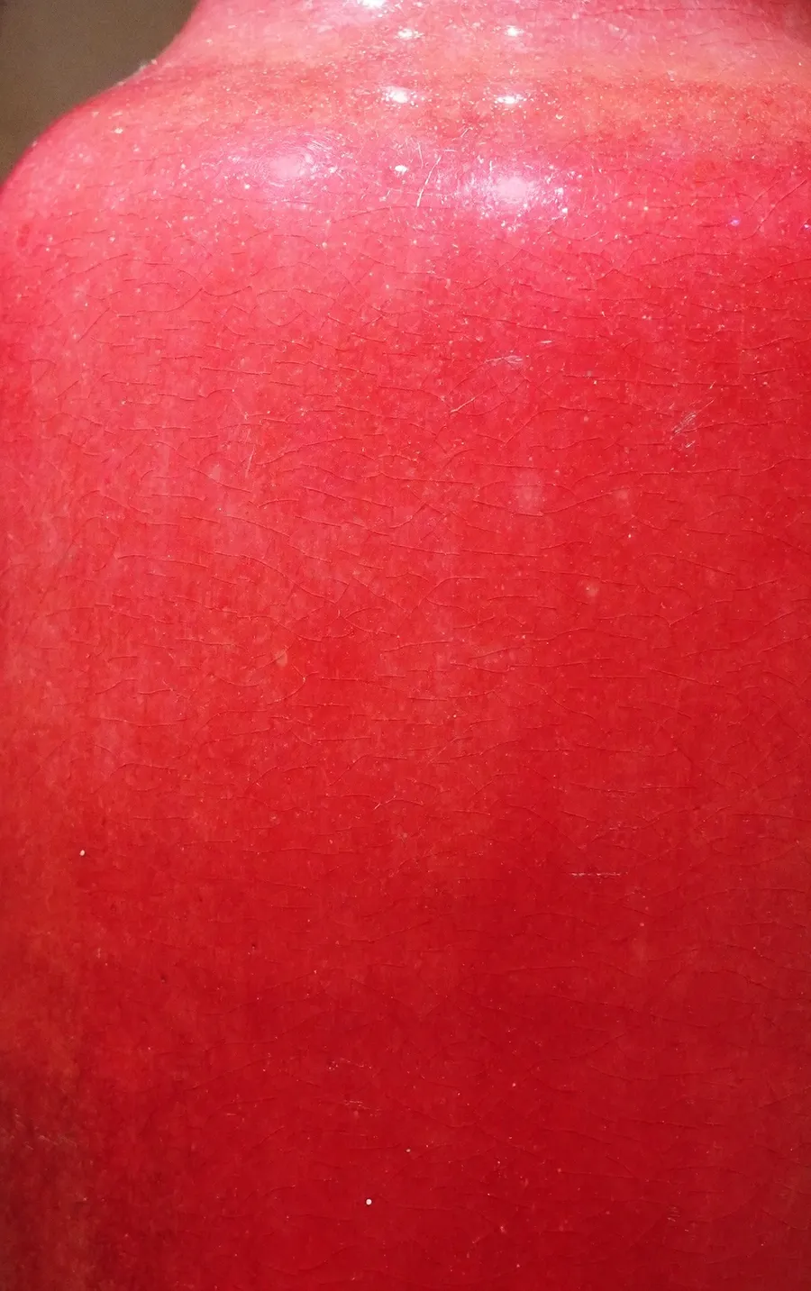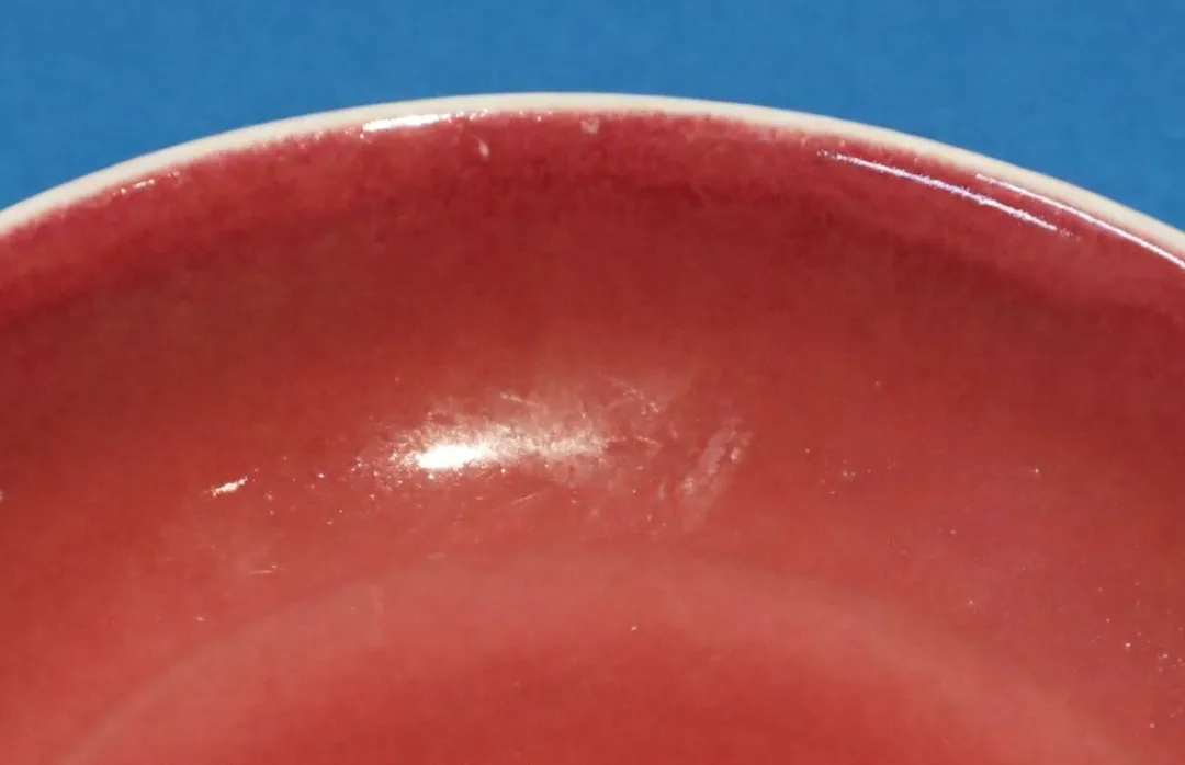 郎廷极烧成的高温铜红釉瓷器和明代的“宝石红”釉还不完全相同,在工艺上釉层更肥厚,反光更要亮一些,或者说“玻璃光泽”更明显,釉面细看的话,常见牛毛纹(细密流淌纹理)与细小的开片纹。